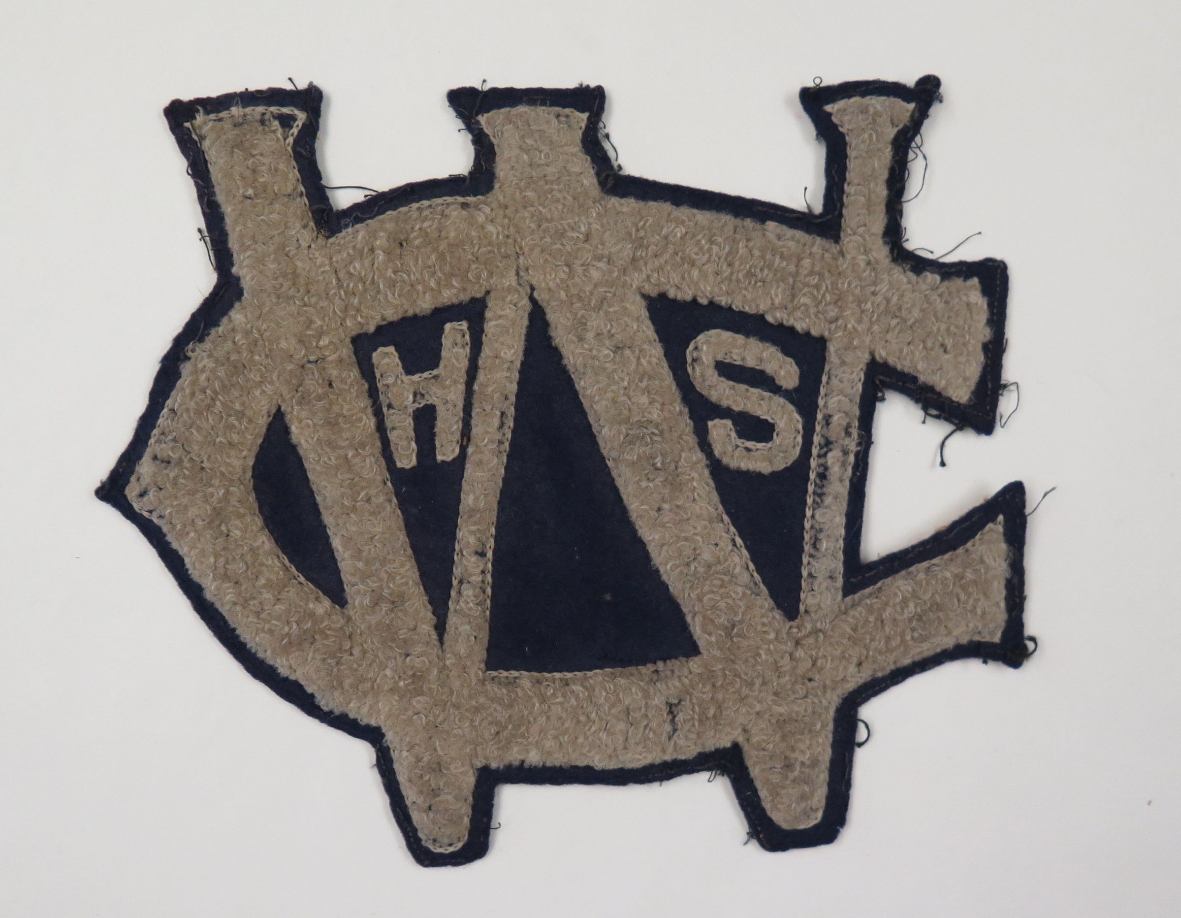 This is a high school letter jacket patch from WCHS. The patch is blue and white. The patch measures 7.75" (h) x 6.5" (w).