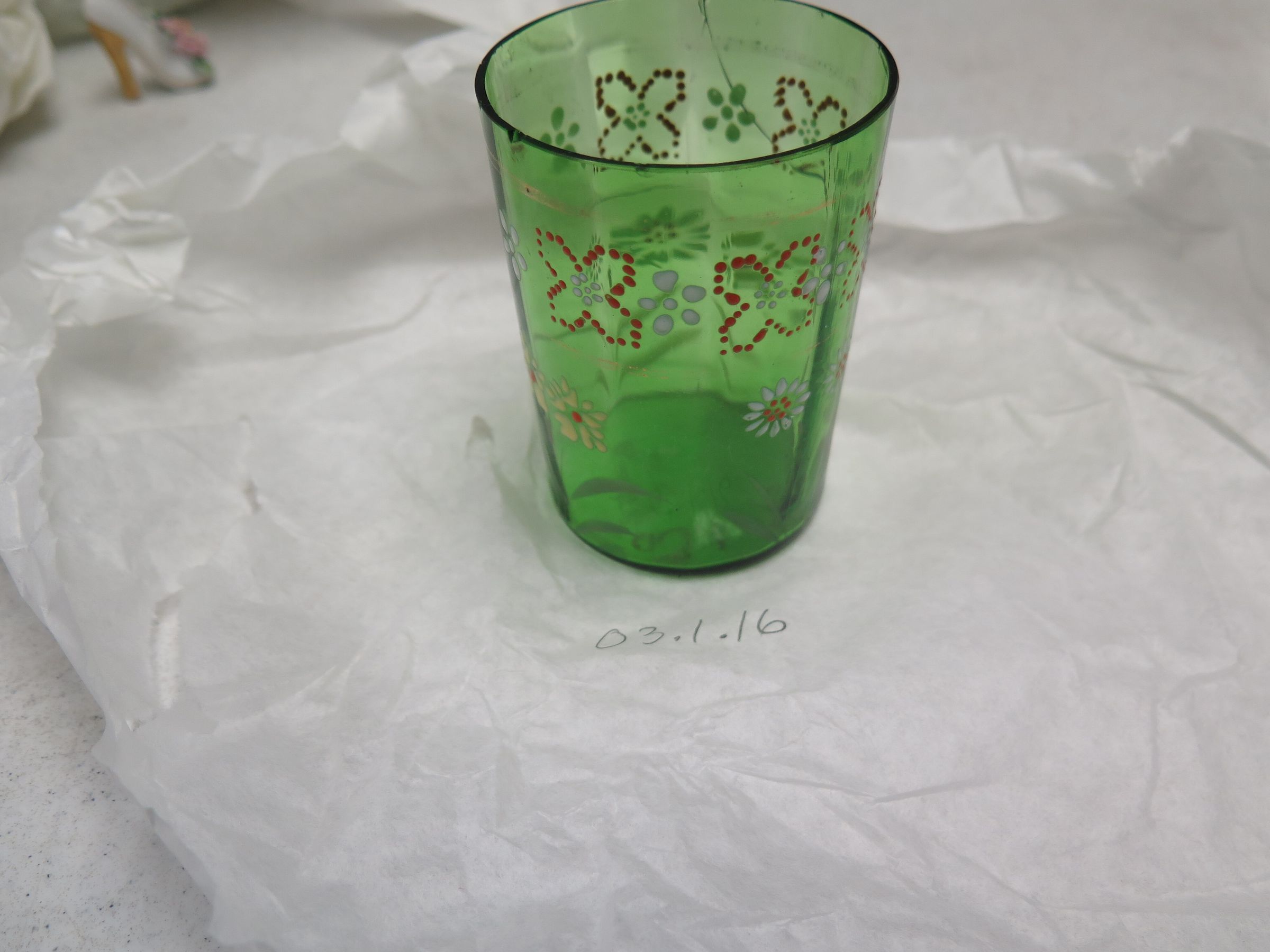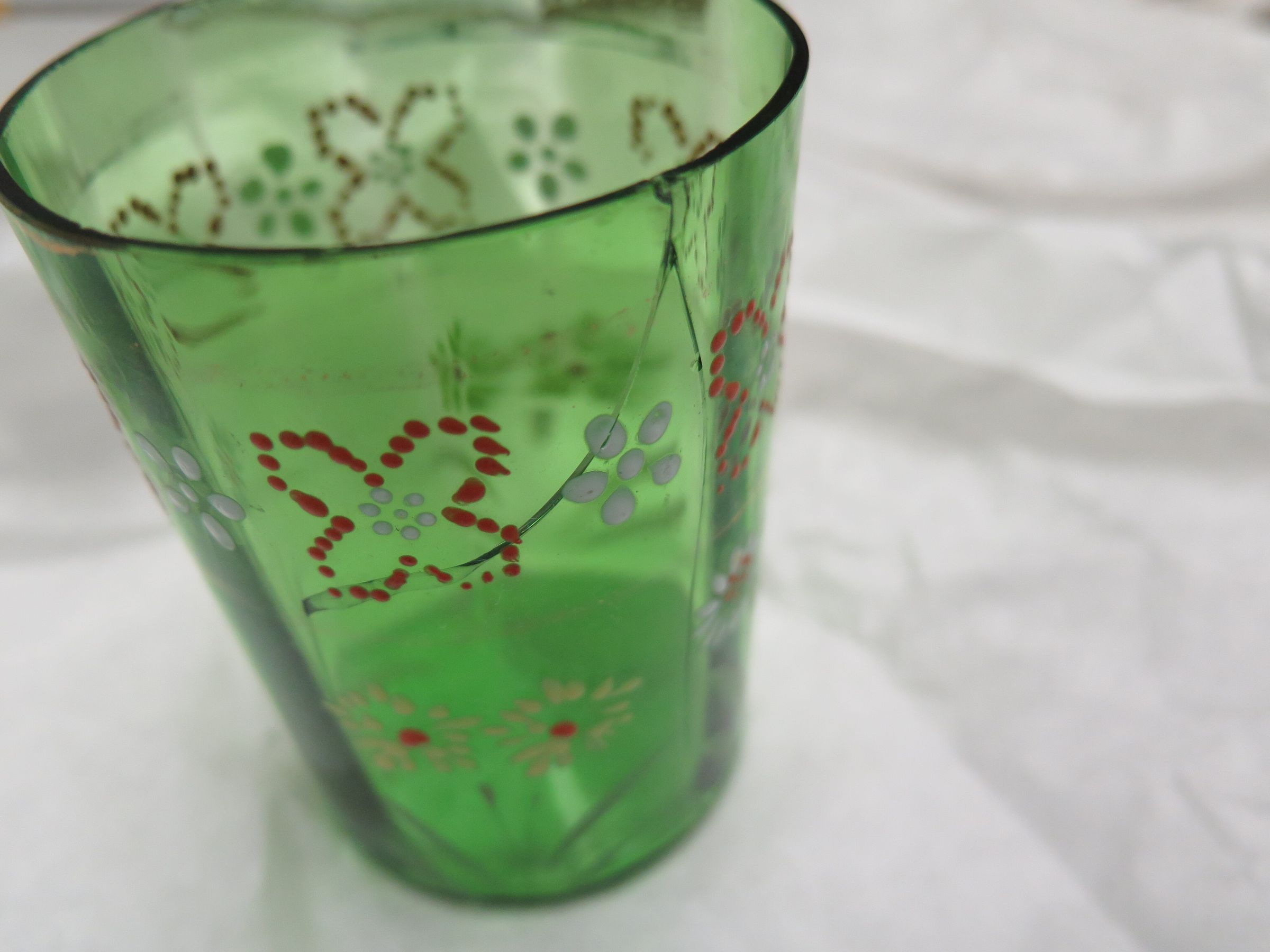 This is a green glass drinking glass with red "x"s on near the rim and a crack on the side. The glass measures 3.75" (h) x 2.5" (dia).