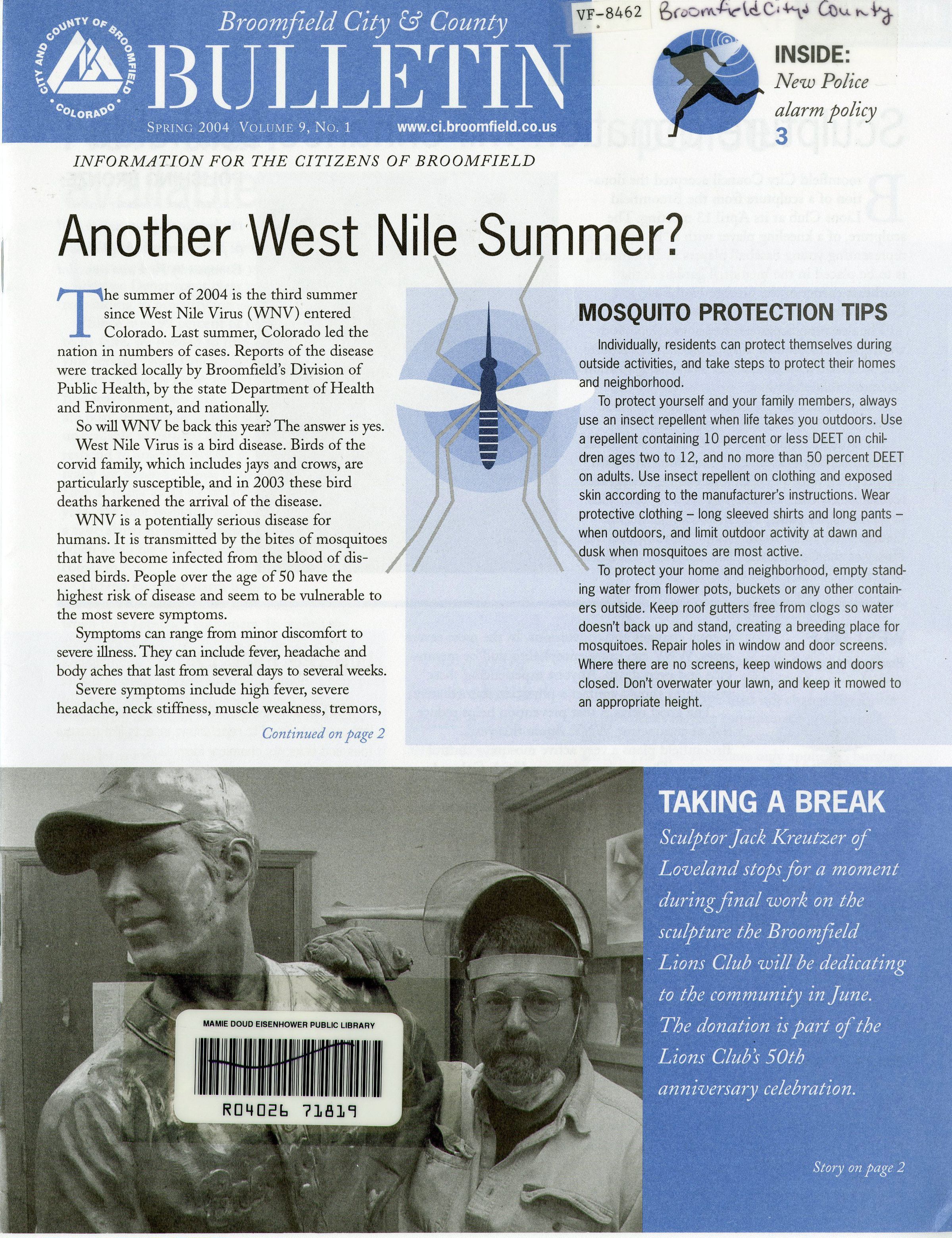 Volume 9 number 1 publication of Broomfield City and County Bulletin. Sections include concerns about the West Nile Virus, a new alarm policy, voluntary water restrictions, expansion of the Call-n-Ride area, and storm water management regulations.Lexicon