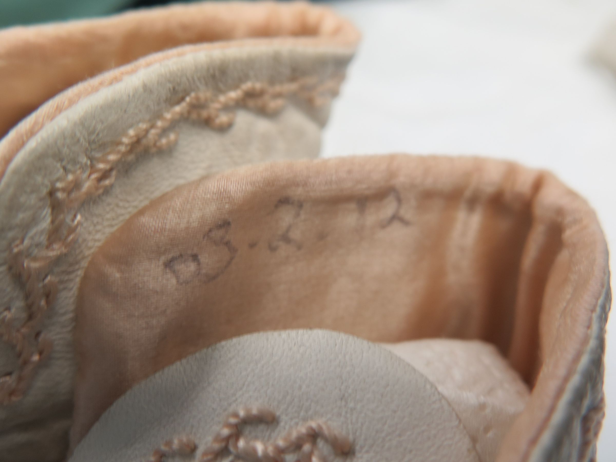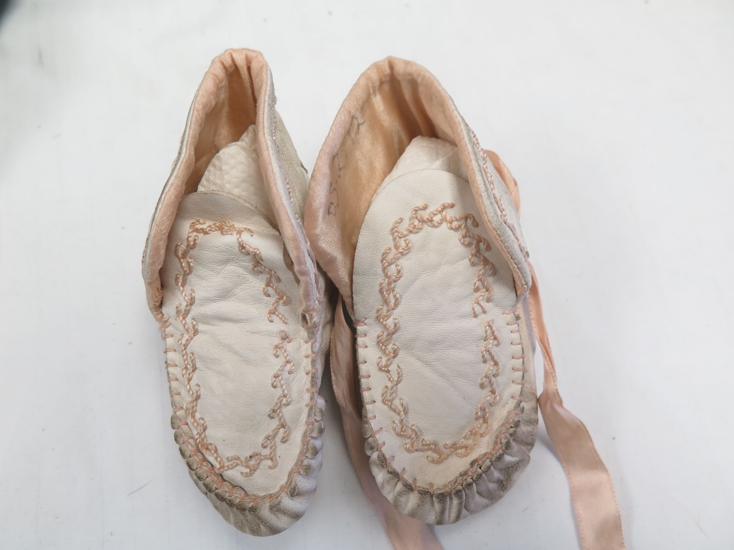 This is a pair of white leather baby bootie shoes with pink ribbon. Each shoe measures 1.5" (h) x 2.25" (w) x 4" (l).