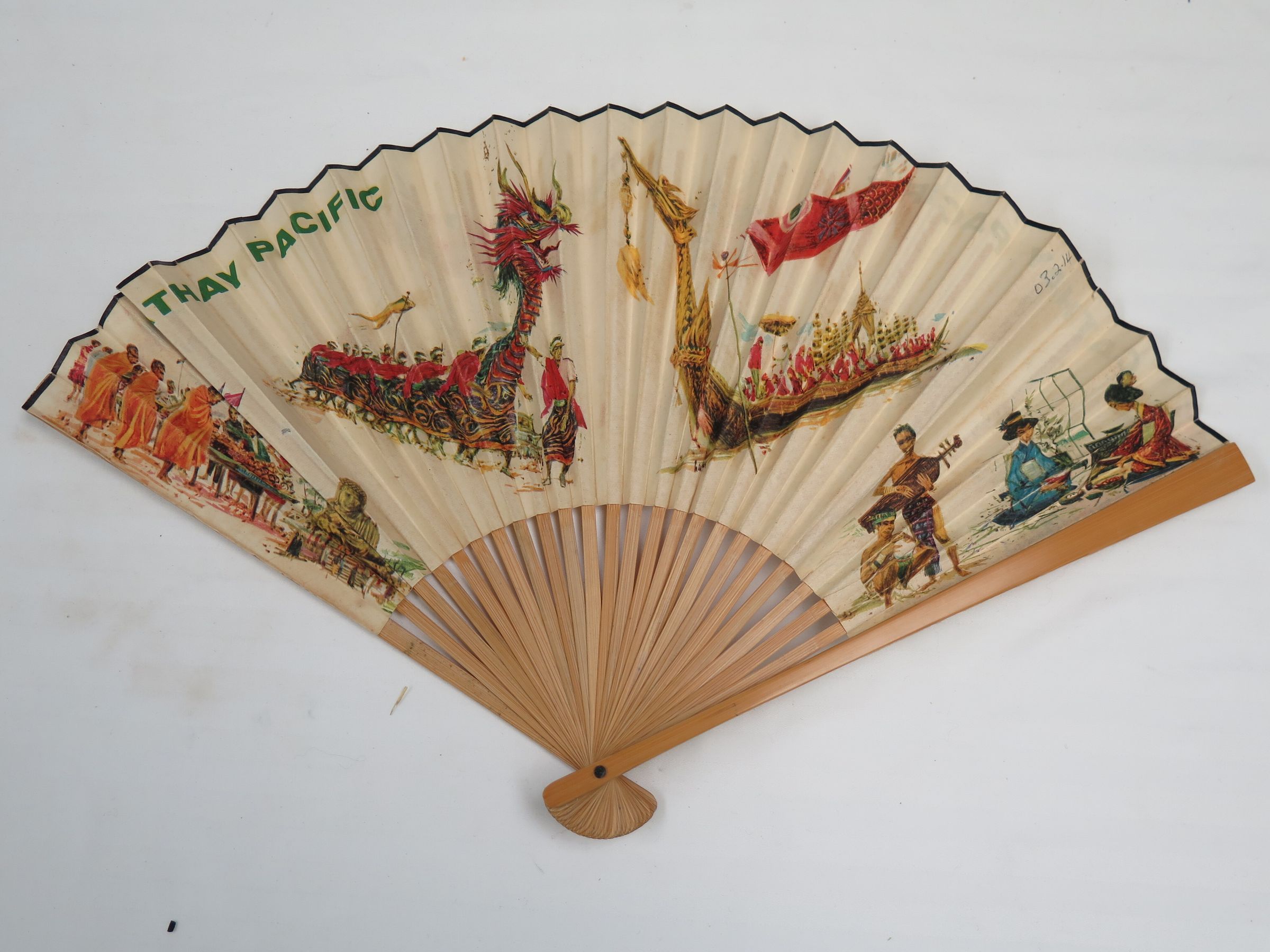 This is a paper hand fan with the text, "Cathy Pacific" on it. The fan also has several images on it. The fan measures 0.5" (h) x 2" (w) x 9" (l).