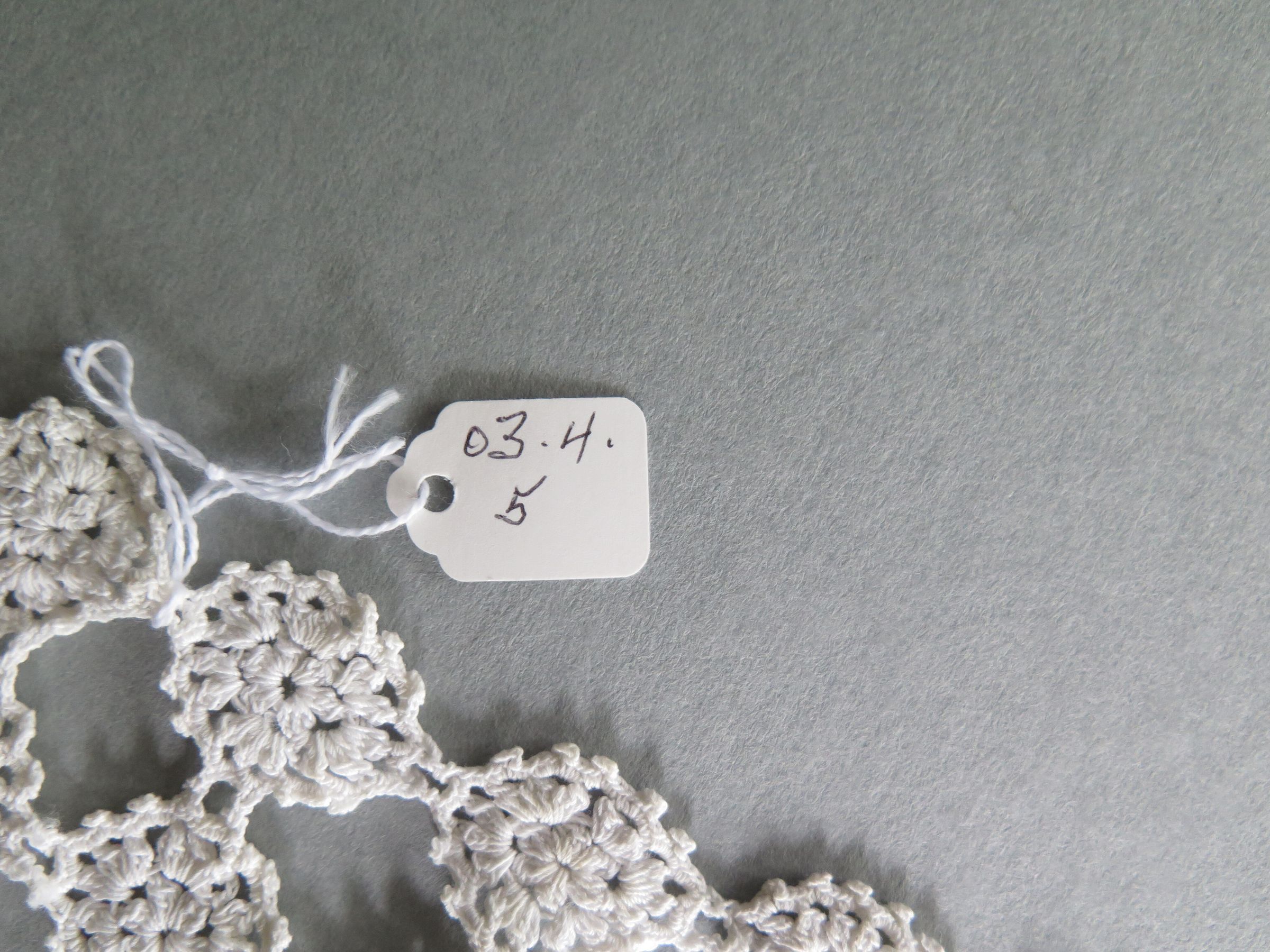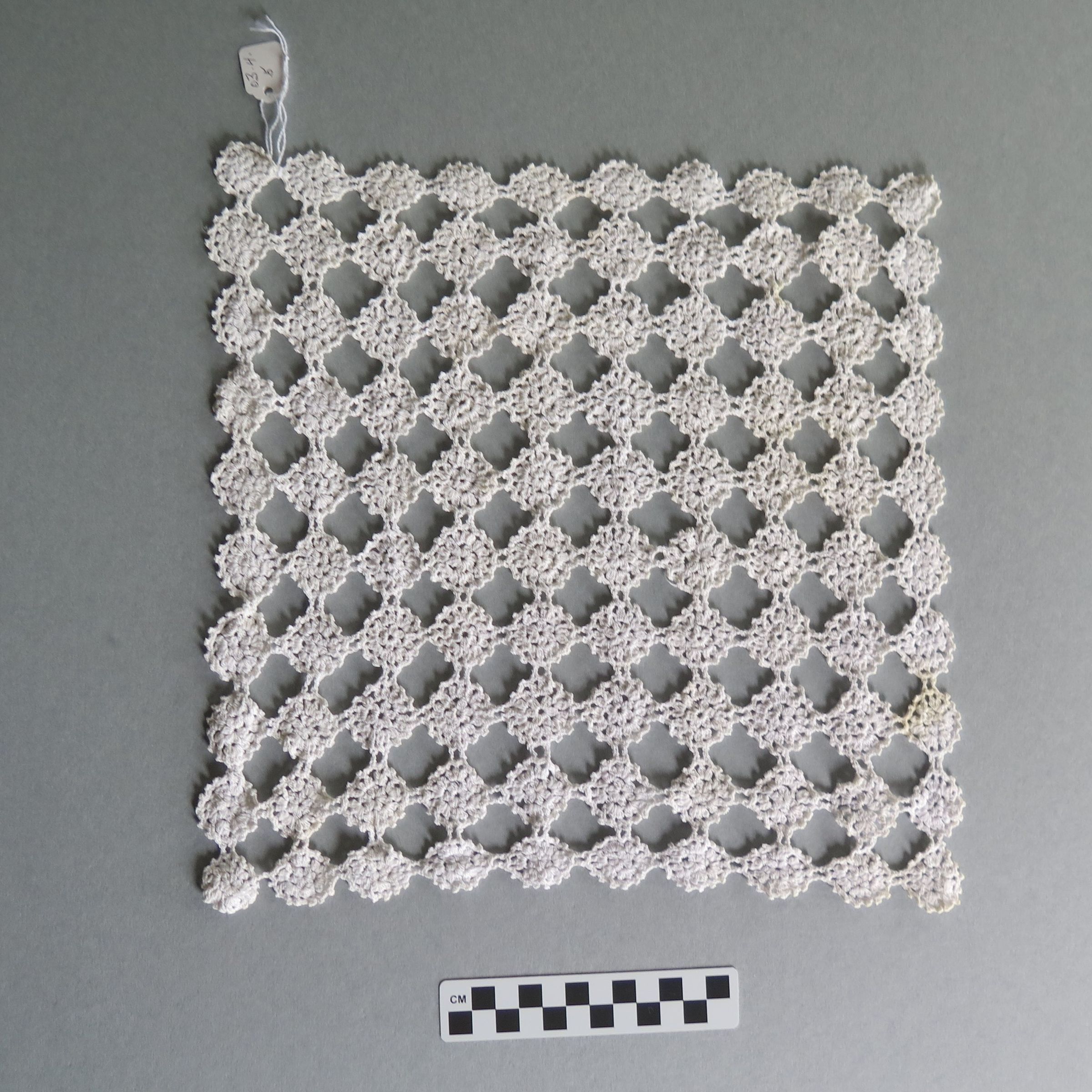 White doily made up of small circular crochet pieces consisting of 10 pieces by 10 pieces. Doily measures 12" (w) x 12" (l).