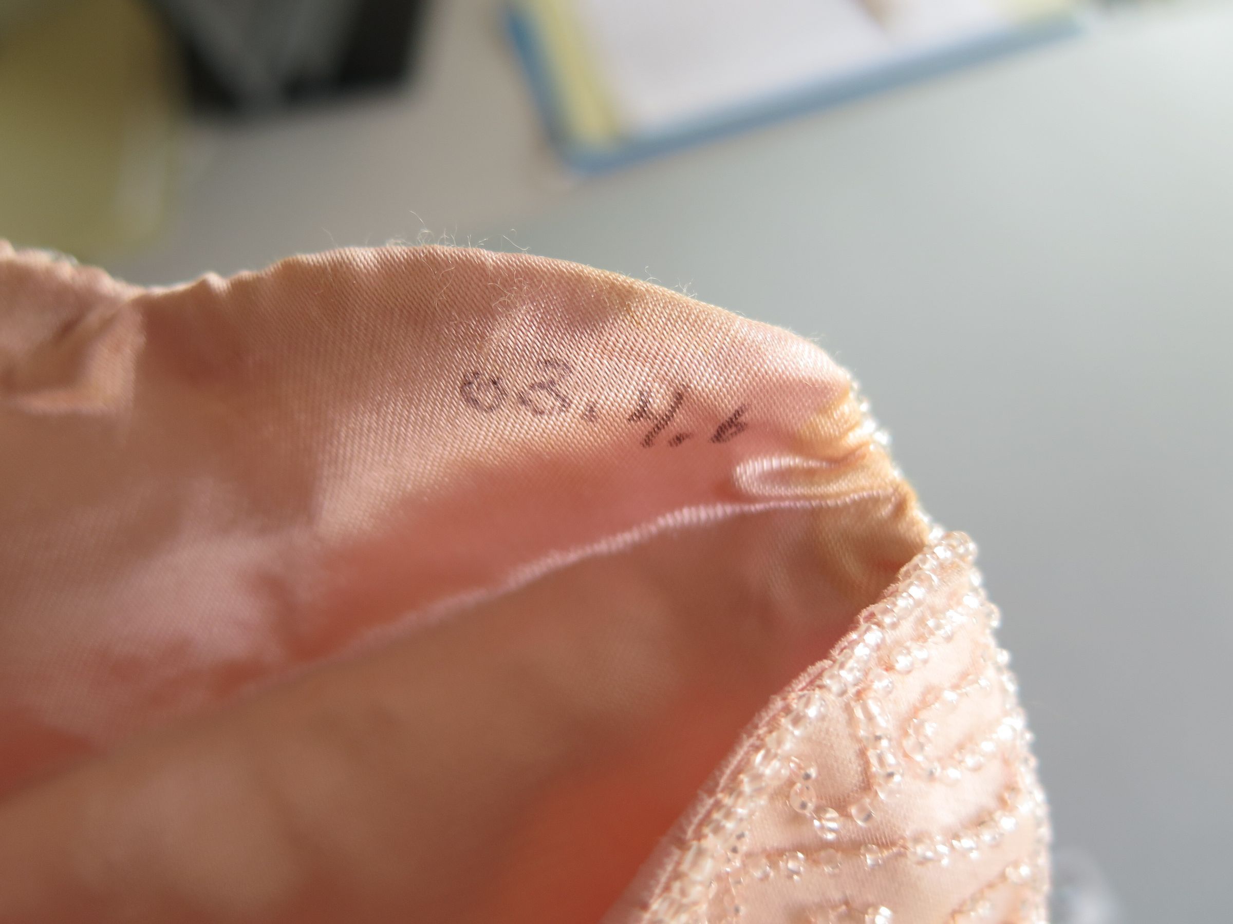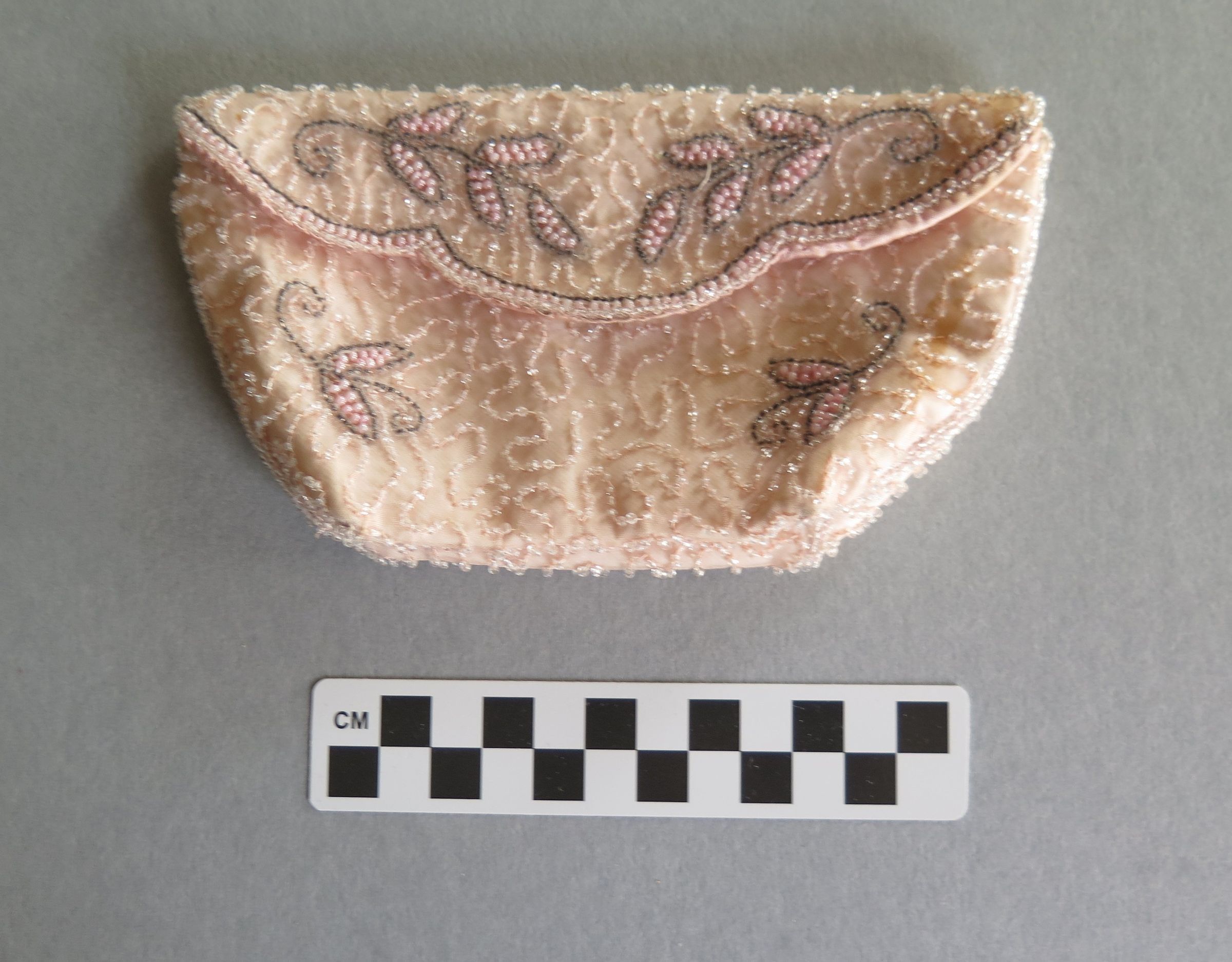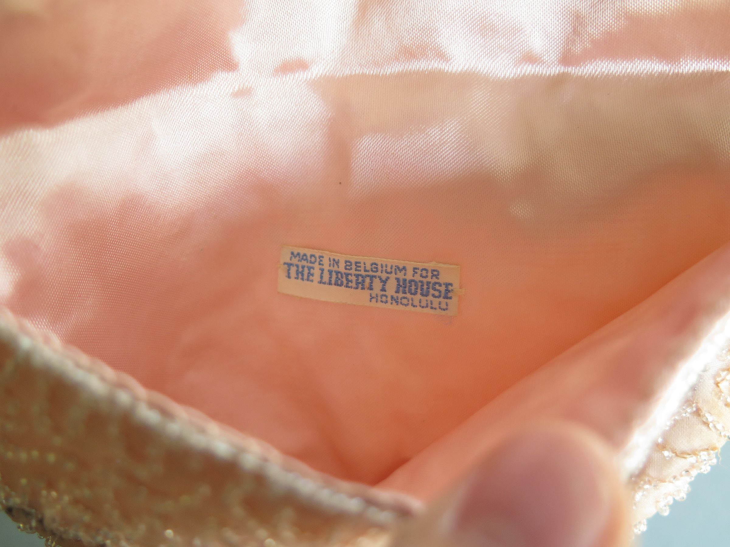 Pink beaded purse with floral design. The top of the purse closes by having overhanging material that then clasps shut. Tag inside the purse reads " Made in Belgium for the Liberty House Honolulu." Purse measures 1" (h) x 3.5" (w) x 6.5" (l).