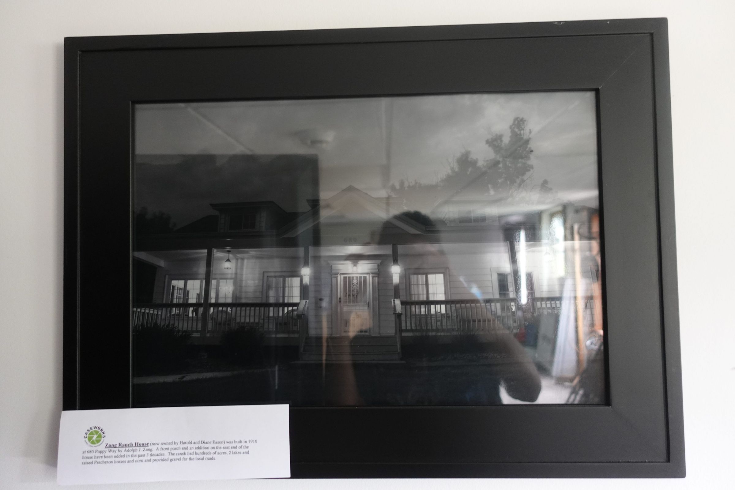 The house was built in 1910 by Adolph J. Zang. A front porch and an addition on the east end of the house have been added in the past three decades. The ranch had hundreds of acres, two lakes, and raised Percheron horses and corn, and provided gravel for the local roads.Photograph Details
