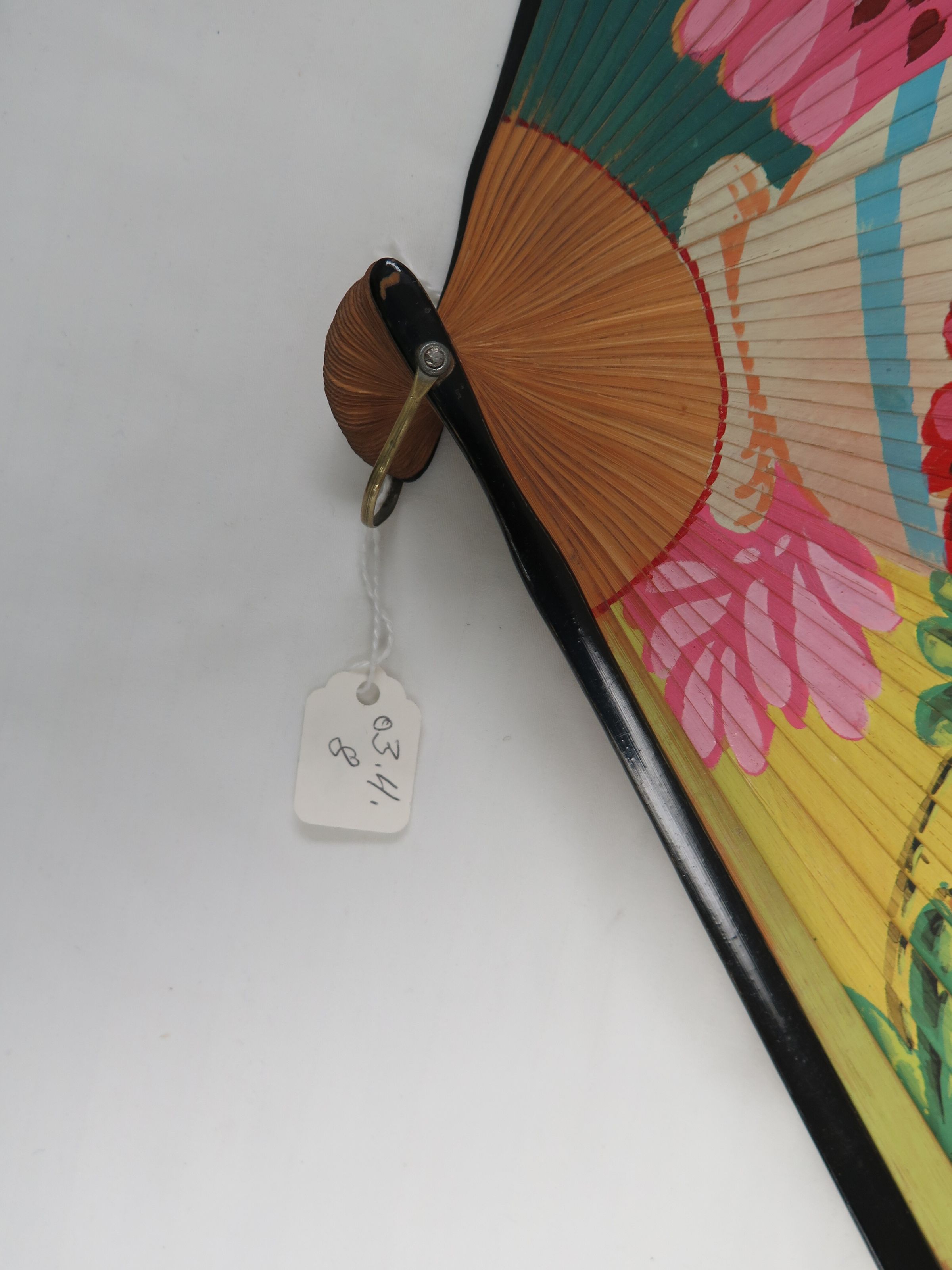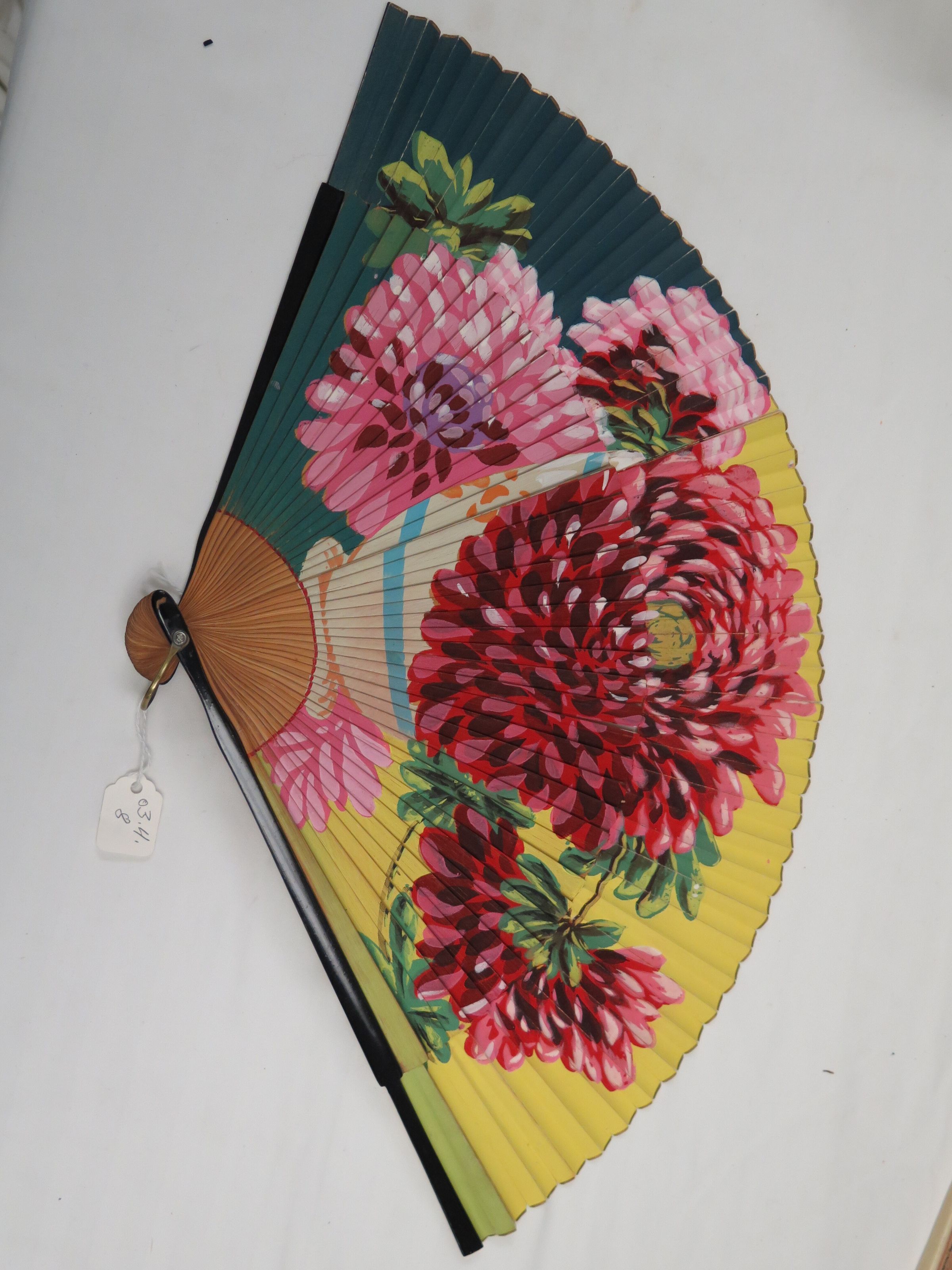This is a wood and paper hand fan. The fan has flowers painted on it. The fan measures 0.25" (h) x 1.5" (w) x 10" (l).