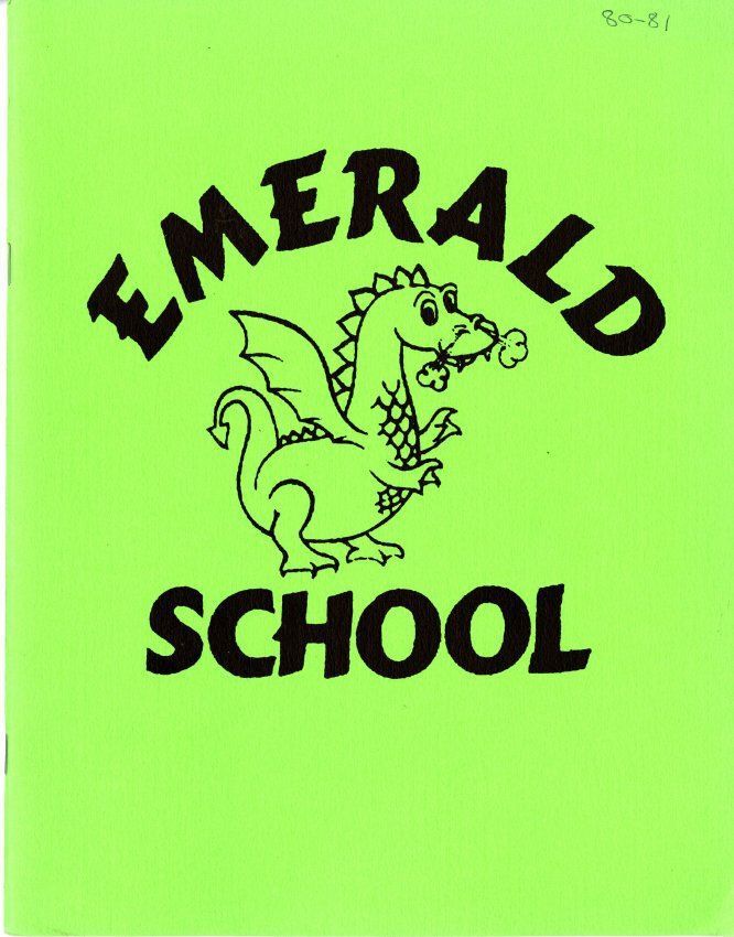 Bright green cover with a dragon illustration. Titled "Emerald School." 1980-1981. Contains black and white pictures of faculty and students from kindergarten to sixth grade.