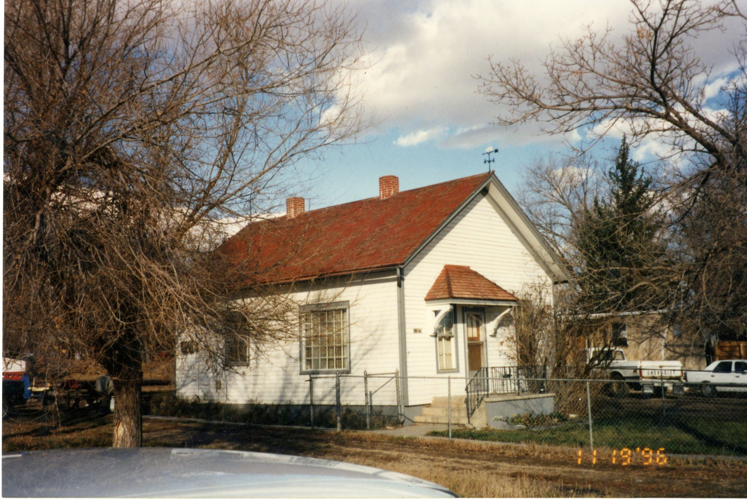 Color photograph of the Broomfield School at 11975 Vance Street. Constructed in 1901, was also known as the Dewoody residence. Reference #5BF199 page 59 Broomfield Historical Landmark report. Building has white siding, shingled gable roof with metal weathervane, two chimneys, 3 windows and 1 door shown. Grass, chain link fence, and trees in foreground, white Chevrolet pickup and light colored sedan in background. Photo taken 11-19-1996.