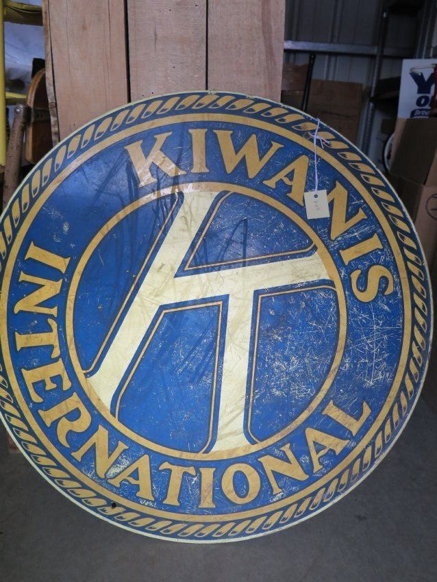 This is a round metal sign. The sign is blue with a gold "K" in the center and the words "Kiwanis Internation" around the edges. The sign has a gold border that is painted to look like rope. The sign measures 30" (dia).
