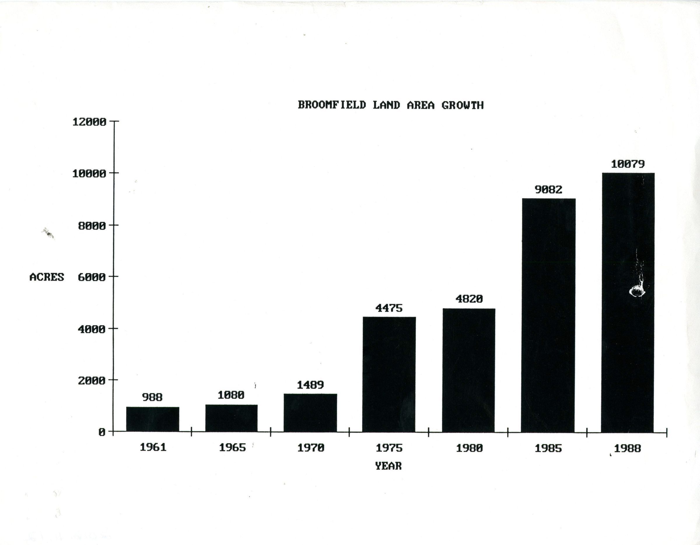 Graph that shows the land area growth of Broomfield in acres through the years 1961 to 1988.Collection