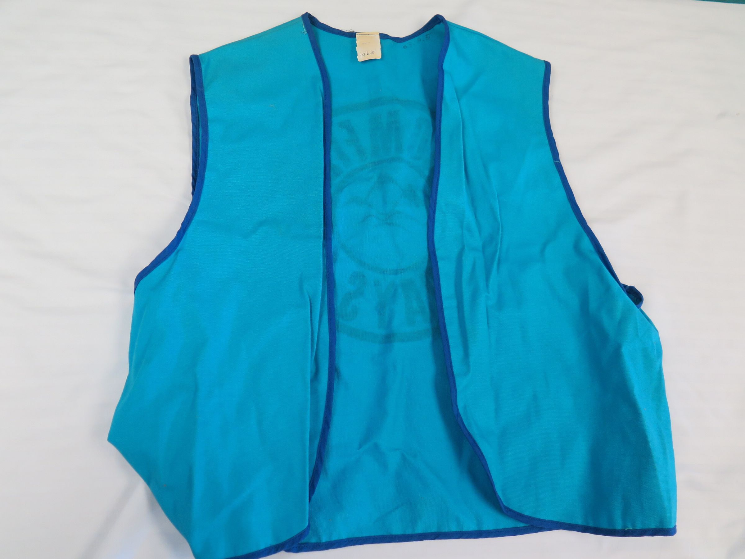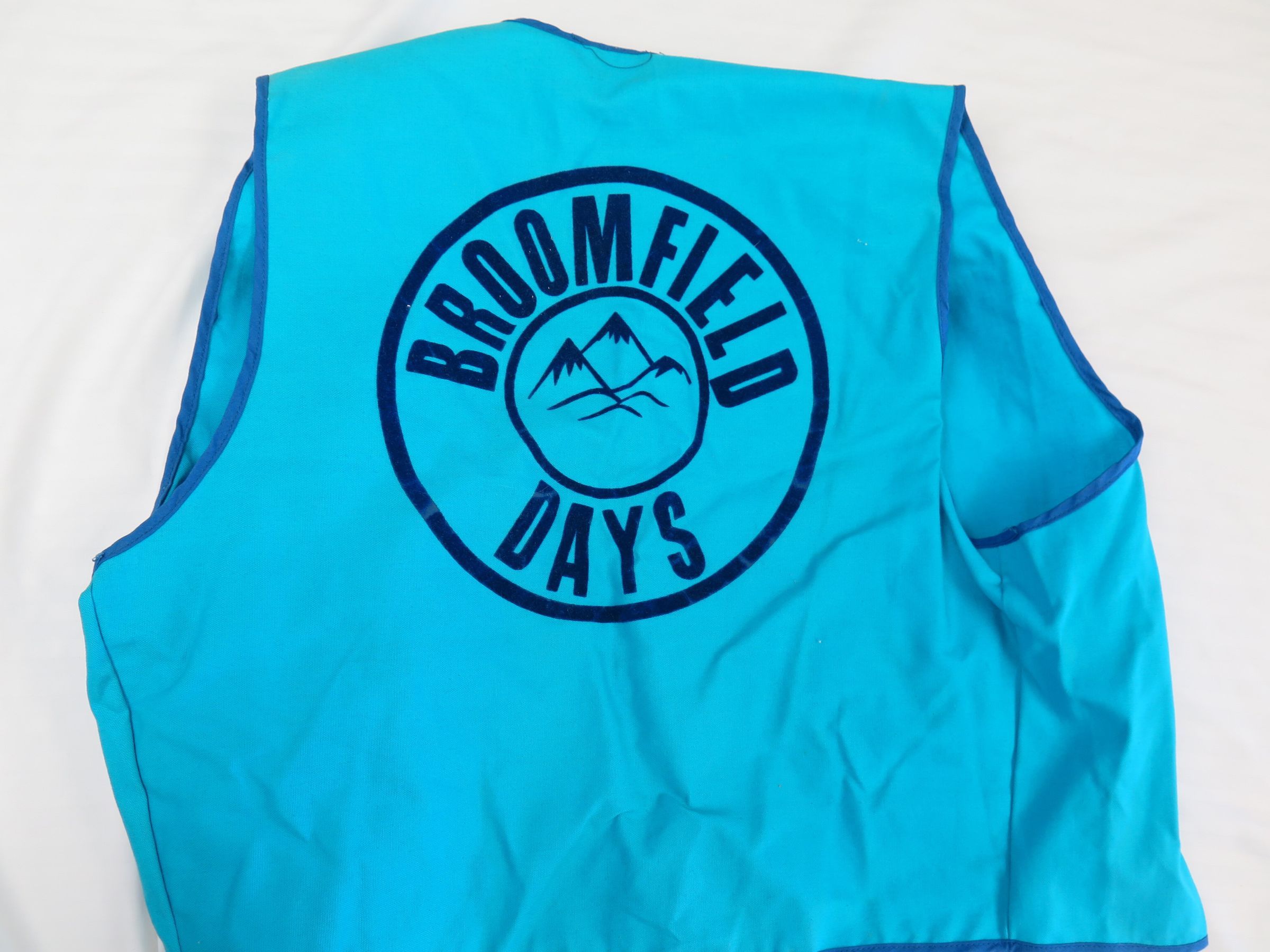 This is a teal colored vest from Broomfield Days in 1965. The vest measures 15" (w) x 21" (l).