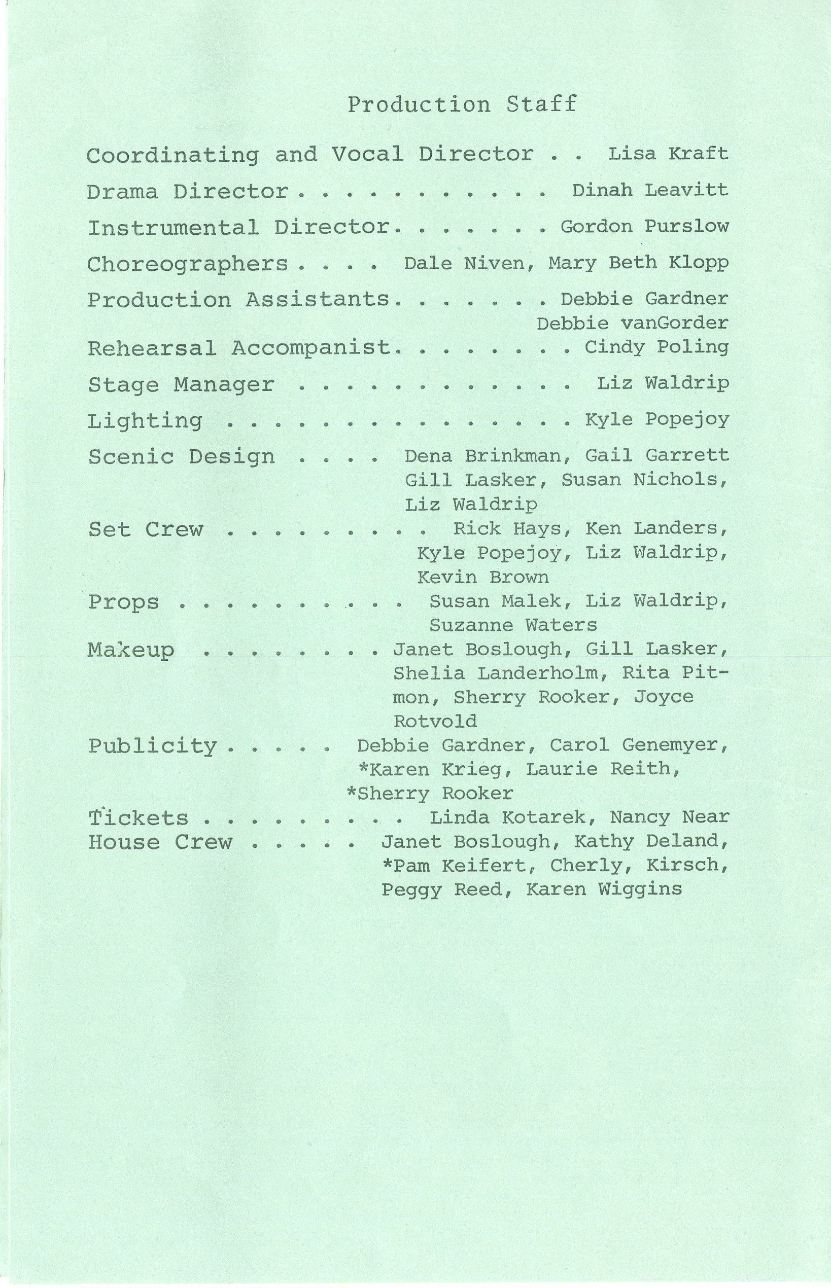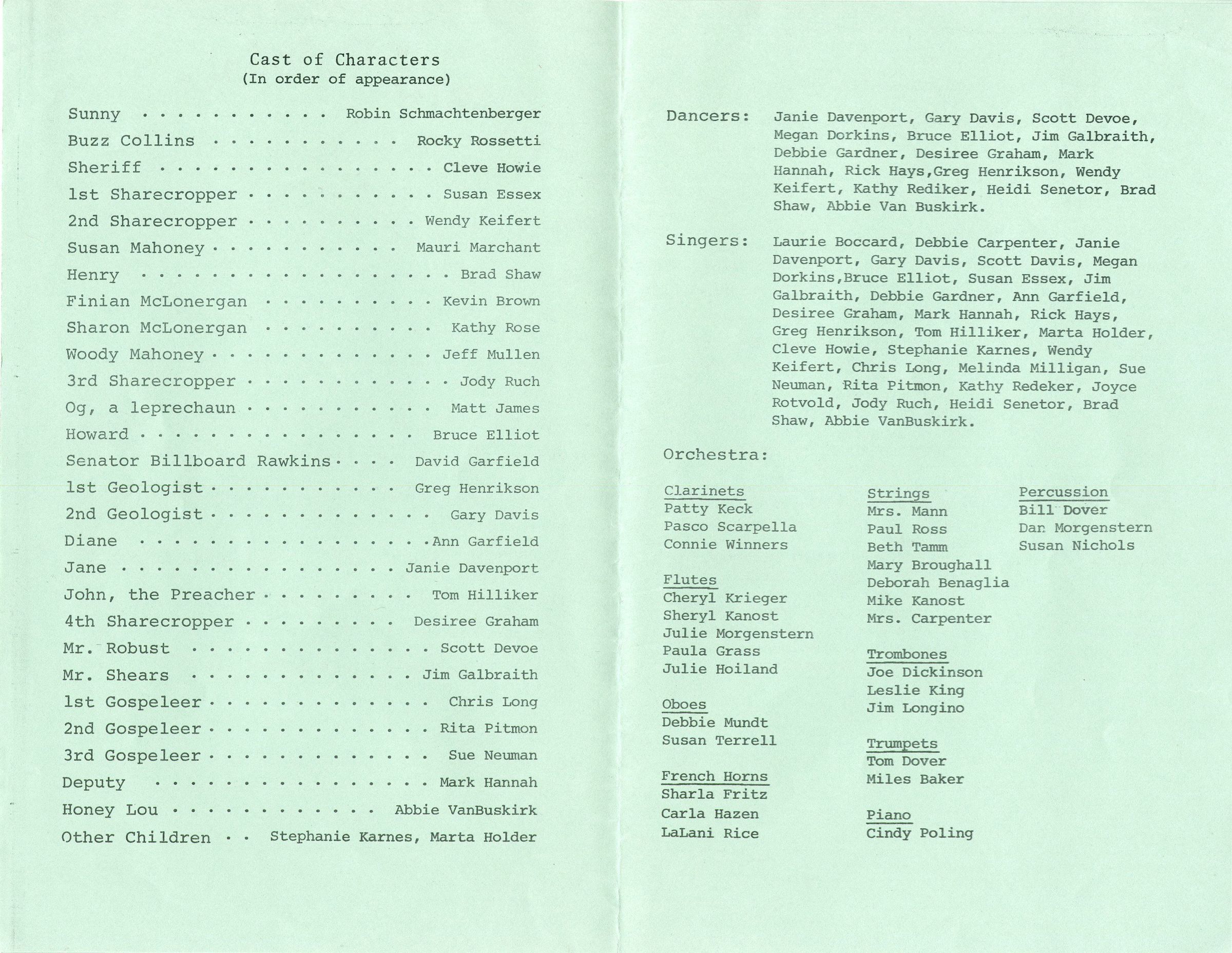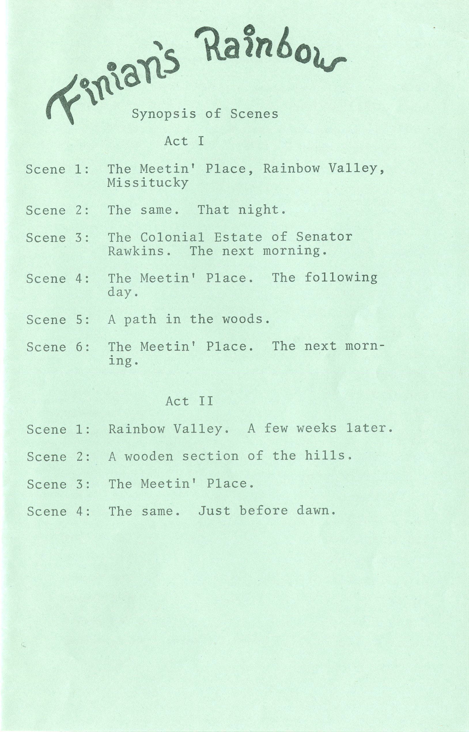 Playbill of Broomfield High School presents Finian's Rainbow. Two 8inx11in green papers folded in half creating a booklet. Frontside has a hand drawn image of a pot of gold and authors for music/lyrics. Inside has synopsis of scenes, cast list and production staff names. Backside is blank.