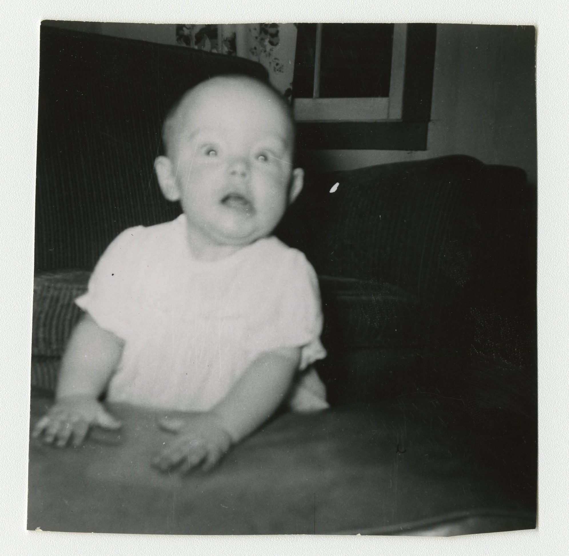 Black and white photograph of a baby. Photograph was taken indoors.