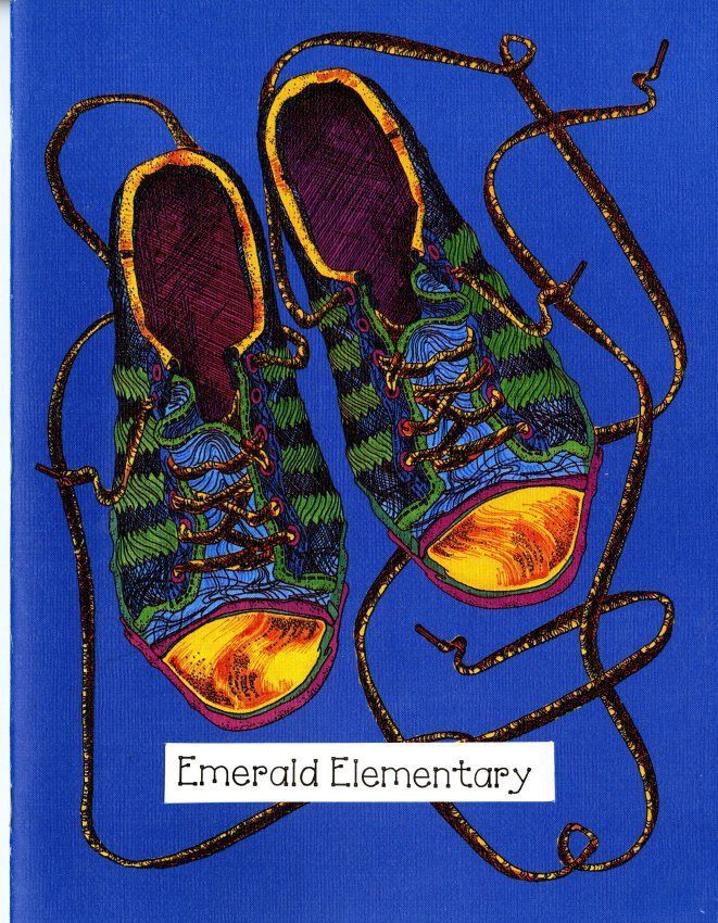 The front cover pictures a pair of colorful shoes in a blue background, along with the name of the elementary school. The first page has a dragon illustration and says "Stepping Into The Future." It contains black and white pictures of students and staff. The back cover is blank.Collection