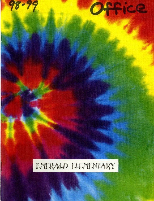 The front cover has a rainbow tie-dye pattern along with the name of the elemntary school. The first page says "Two Thmbs Up for...Home of the Dragons" and has a dragon illustration. It contains black and white pictures of students and faculty. The rainbow pattern continues on the back cover.