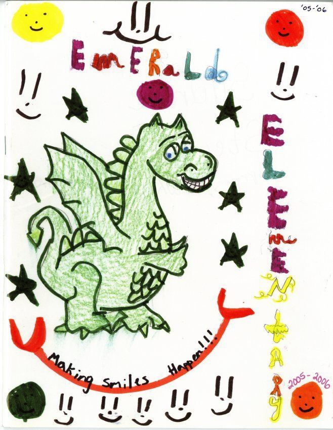 The front cover features the art work of a student which has a dragon and the name of the elementary school. The first page has portraits of students and staff says "Emerald Makes Us Happy." It contains pictures of students and staff. There is also an autograph page at the end. The back cover also pictures the art work of a student.