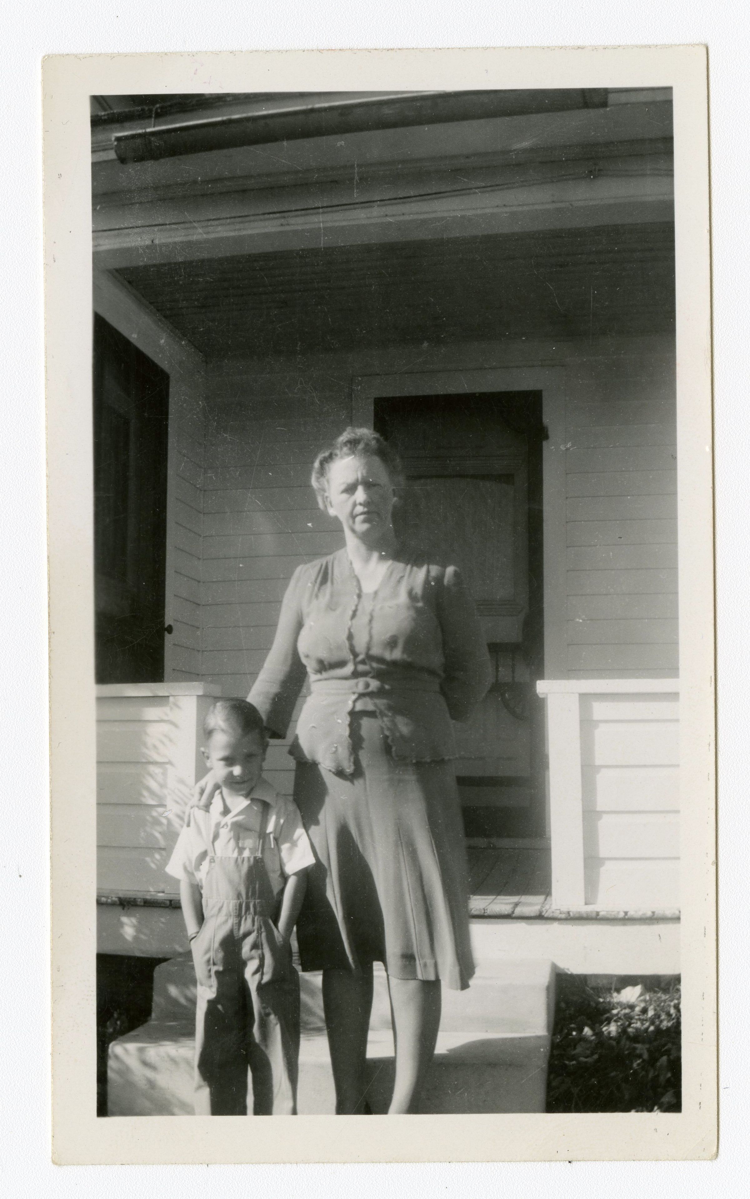 Black and white photograph of two people, a woman and a boy, standing in front of a house. The woman is wearing a dress. The boy is wearing a white shirt and overalls. They are standing in front of a porch. The woman is Lib Brunner and the boy is probably Lester K Brunner. Photograph was taken at the Brunner Farmhouse.
