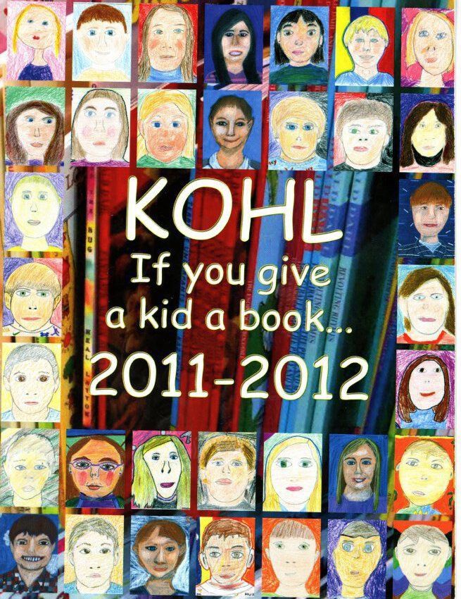 The front cover has numerous self-portraits of students and the book is titled "KOHL. If you give a kid a book... 2011-2012." The yearbook features photos of faculty and students from preschool through fifth grade. The back cover also has many self-portraits of the students.