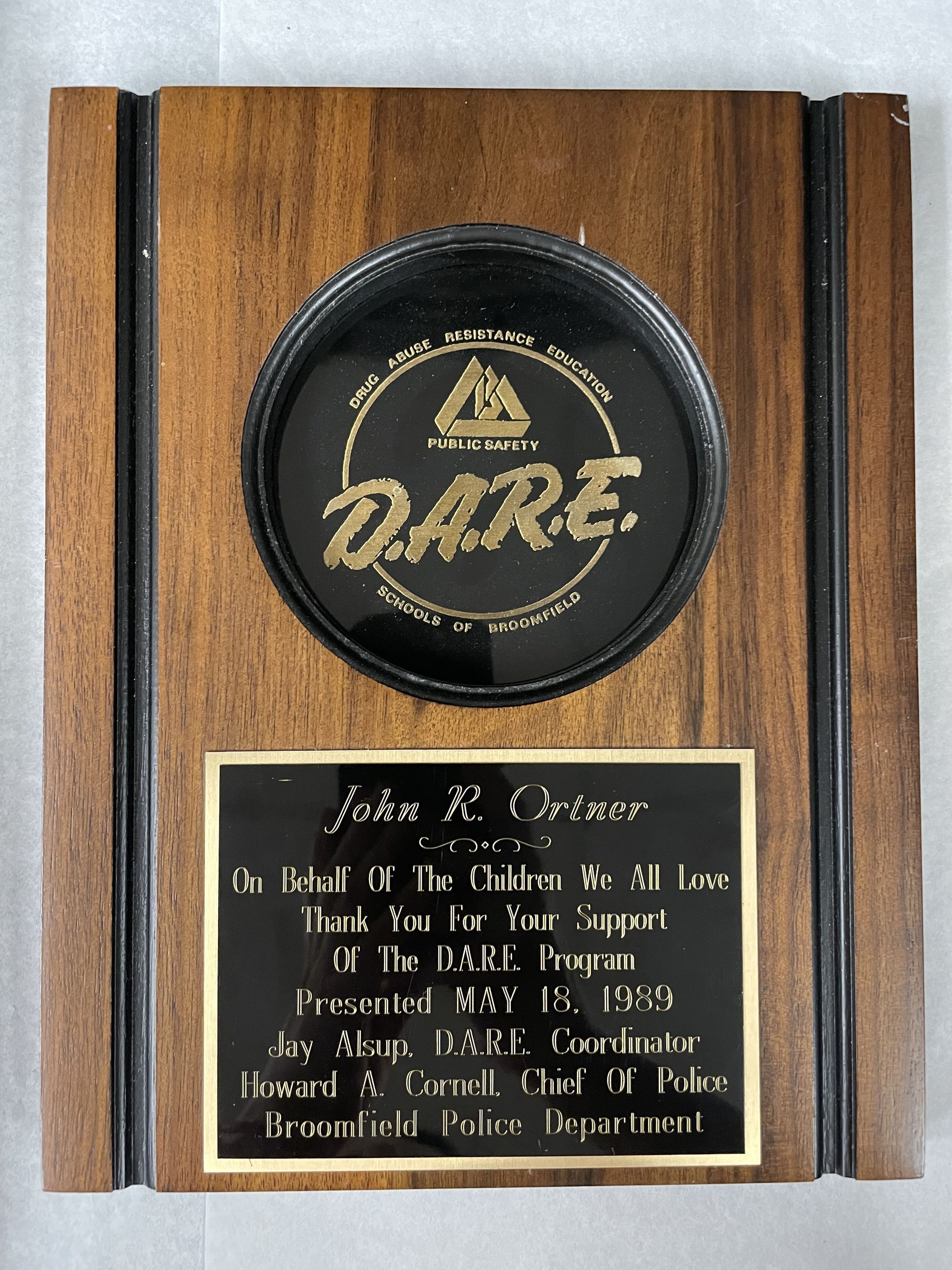 It was awarded to John R. Ortner for his contribution to the D.A.R.E. (Drug Abuse Resistance Education) program on May 18, 1989 by the coordinator- Jay Alsup, Chief of Police- Howard A. Cornell.Collection