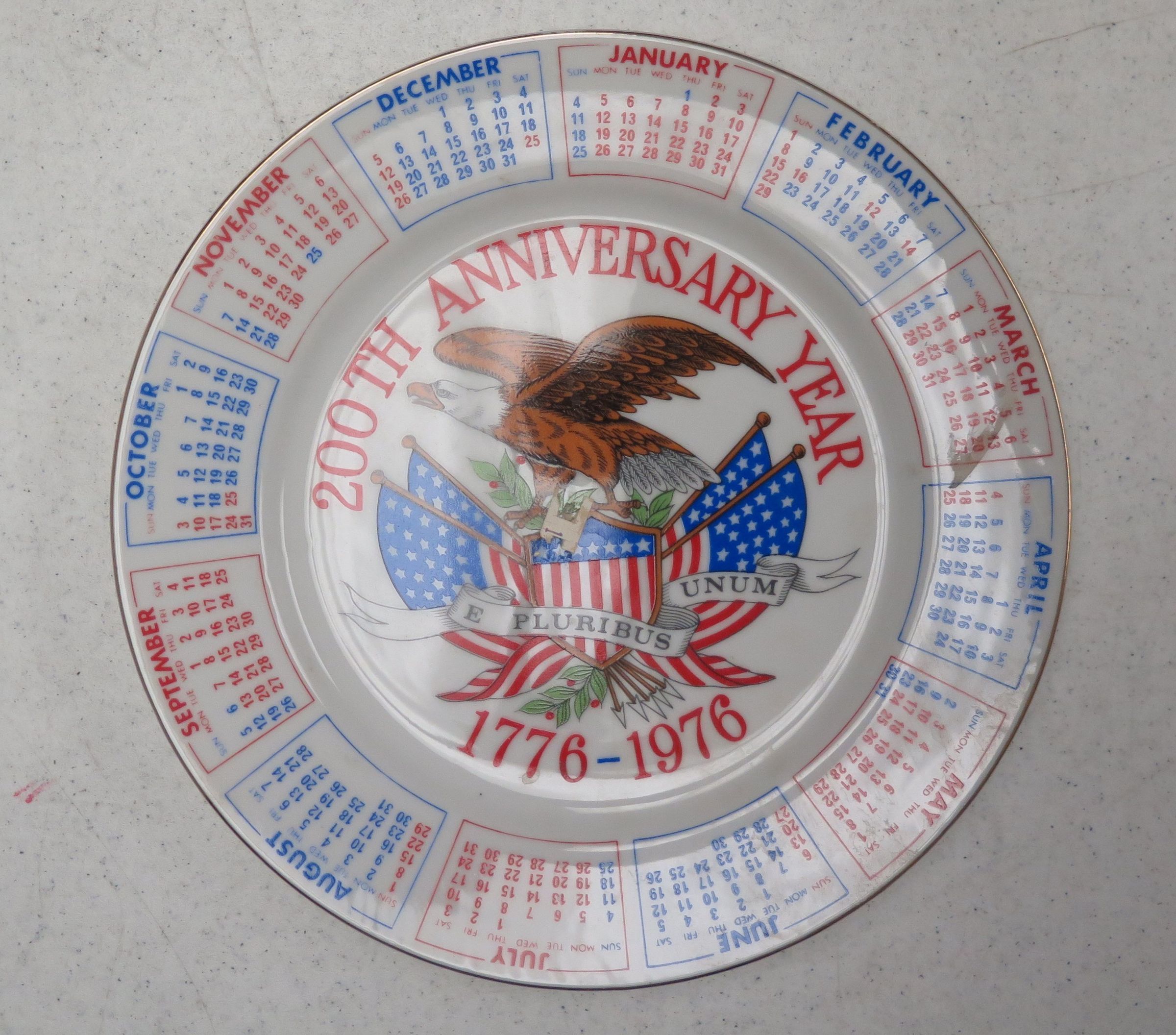 This is a white ceramic decorative plate 9.25"(Dia) that celebrates the U.S. bicenntinnial. The 1976 calendar borders the center of the plate which is decorated with icons of patriotic symbolism.