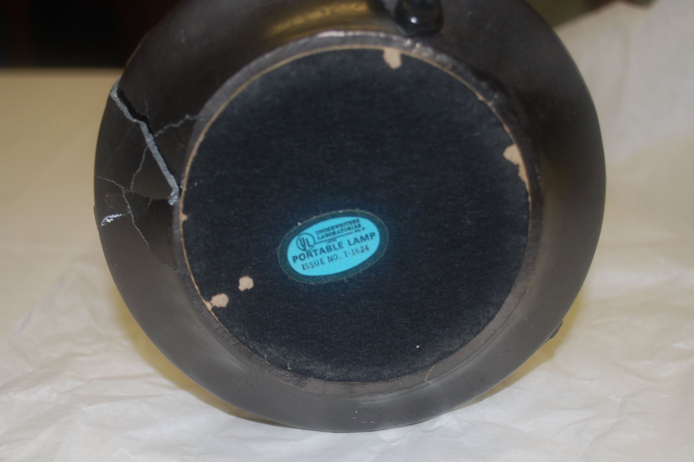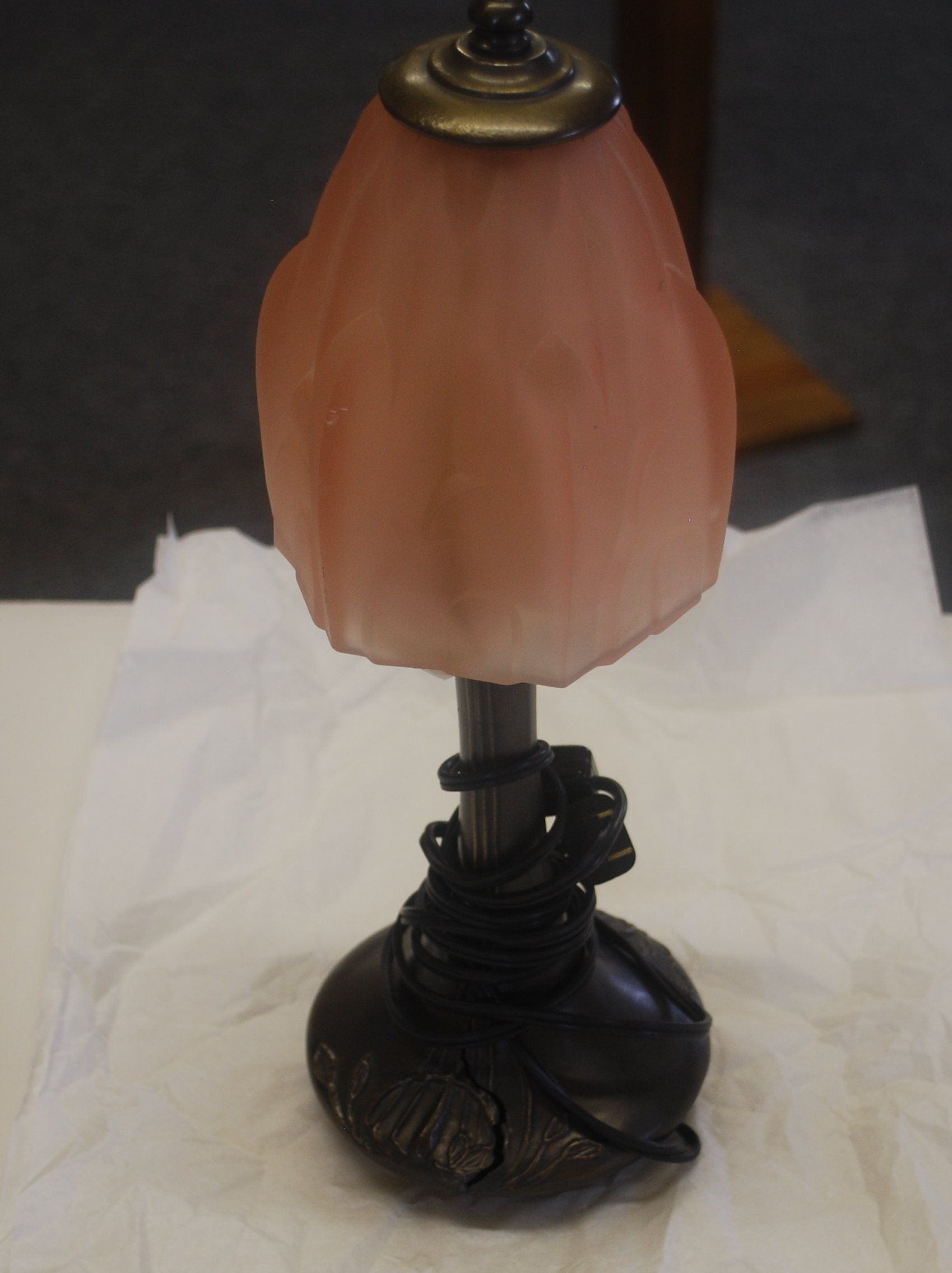 Metal lamp base with pink glass lamp shade. The base is cracked. It measures 14.5" (h) x 4.75" (d) all together. The sticker on the bottom of the lamp reads "Portable lamp Issue No. 1624".