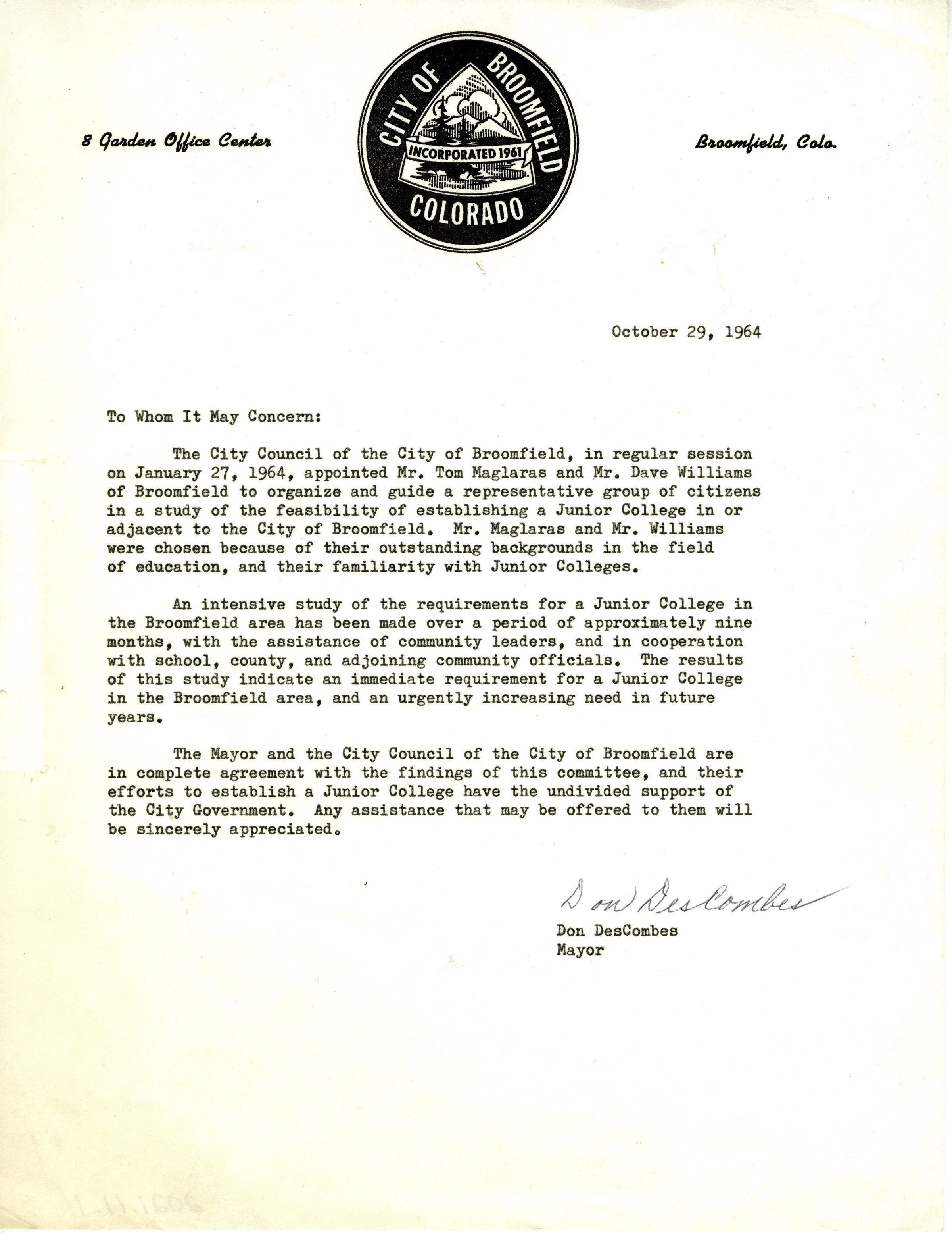 A typed letter with an original signature of Mayor Don DesCombes. The letter is talking about a decision made on January 27, 1964, it was written in October 29, 1964. The format is more like a memo. Mr. Tom Maglaras and Mr. Dave Williams were in charge of figuring if a junior college could be placed in the town of Broomfield. Later on the Junior College became Front Range Community College.Collection