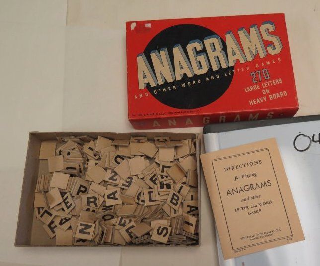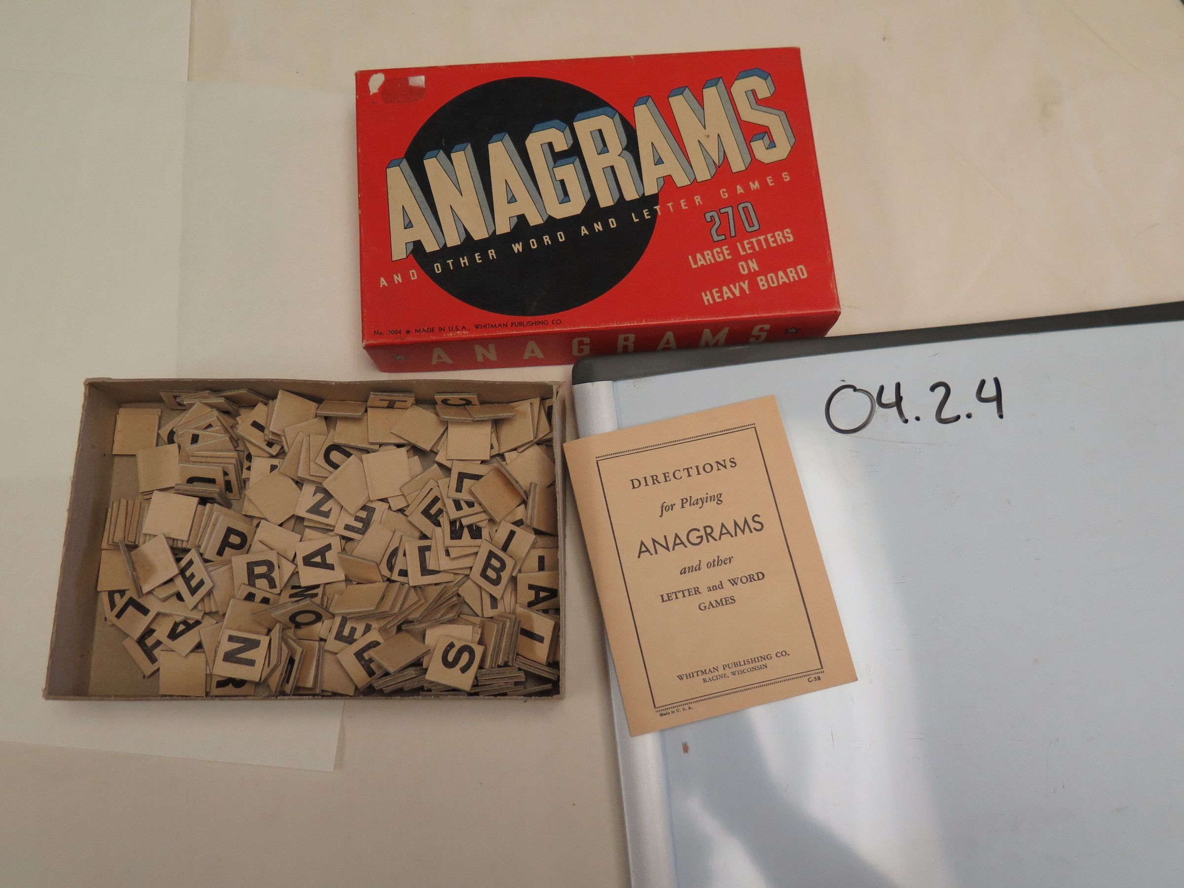 This "Anagrams" game includes tiles, directions, and the box. The box measures 1.5" (h) x 5.5" (w) x 8" (l).