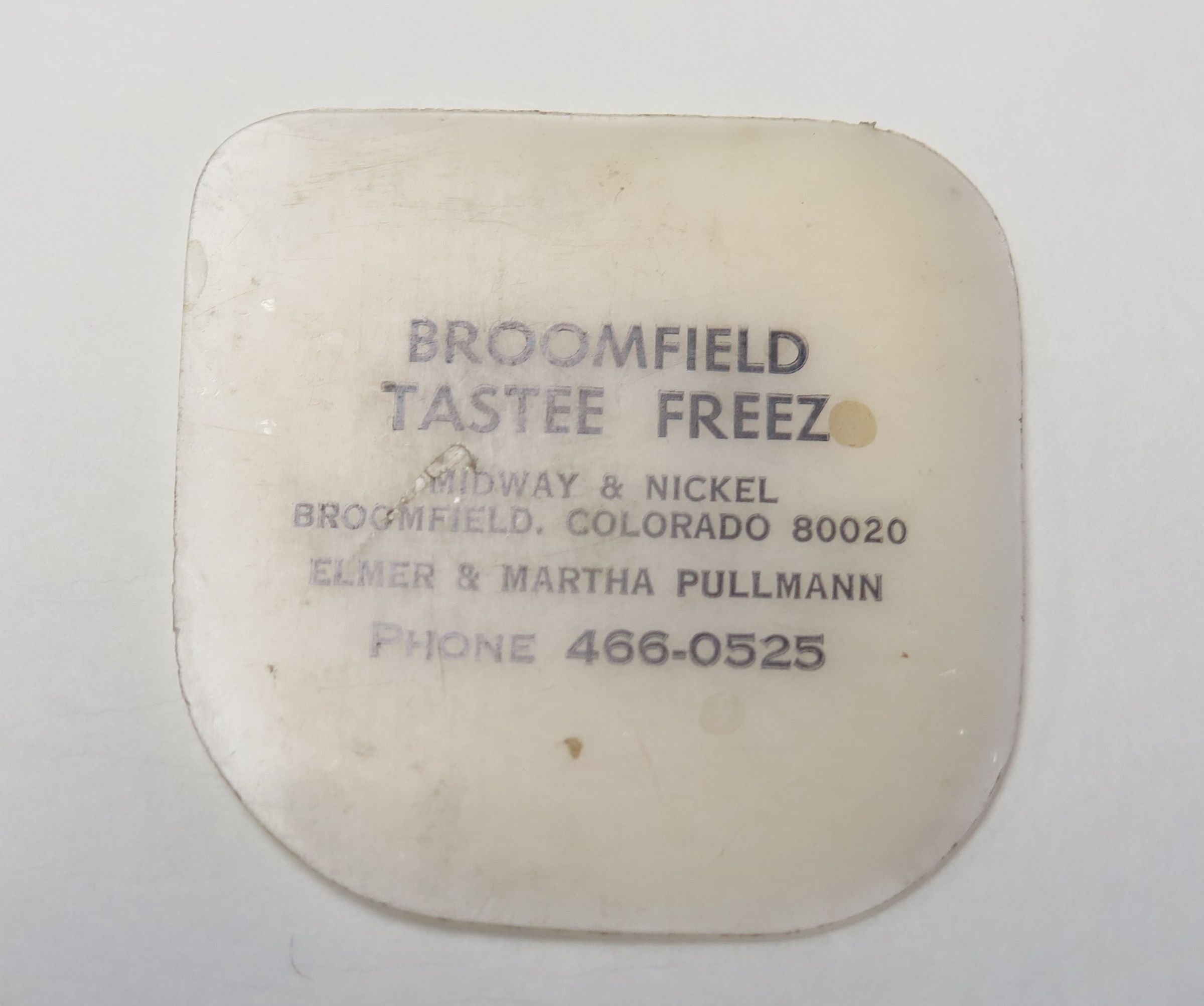 This white pan scraper measures 2.5" (w) x 2.5" (l). It has blue text on the front reading "Broomfield Tastee Freeze".