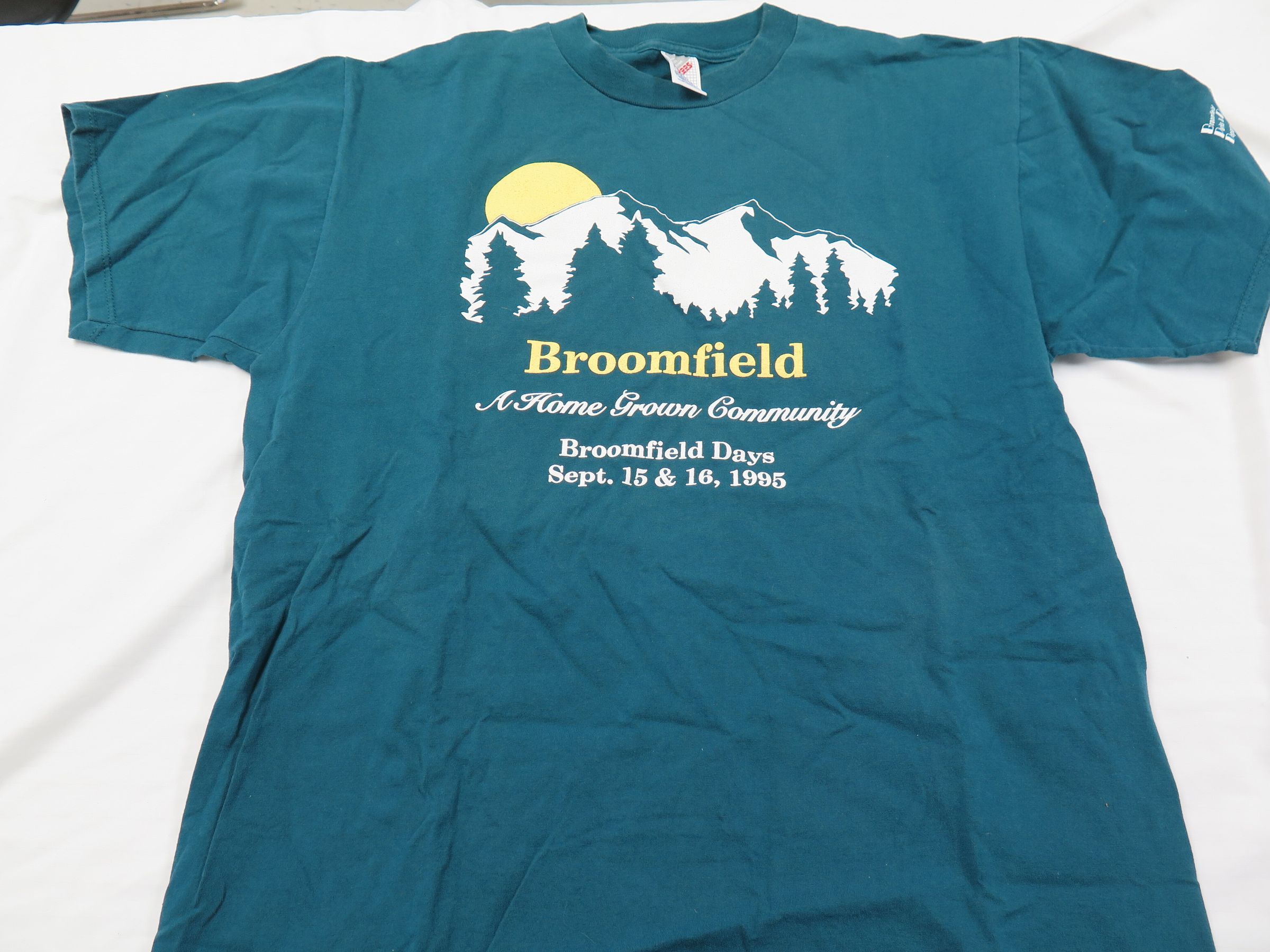 This is a green t-shirt from Broomfield Days 1995. The yellow and white text on the front of the shirt reads, "Broomfield/ A Home Grown Community/ Broomfield Days/ September 15 & 16, 1995" The shirt is a size L.