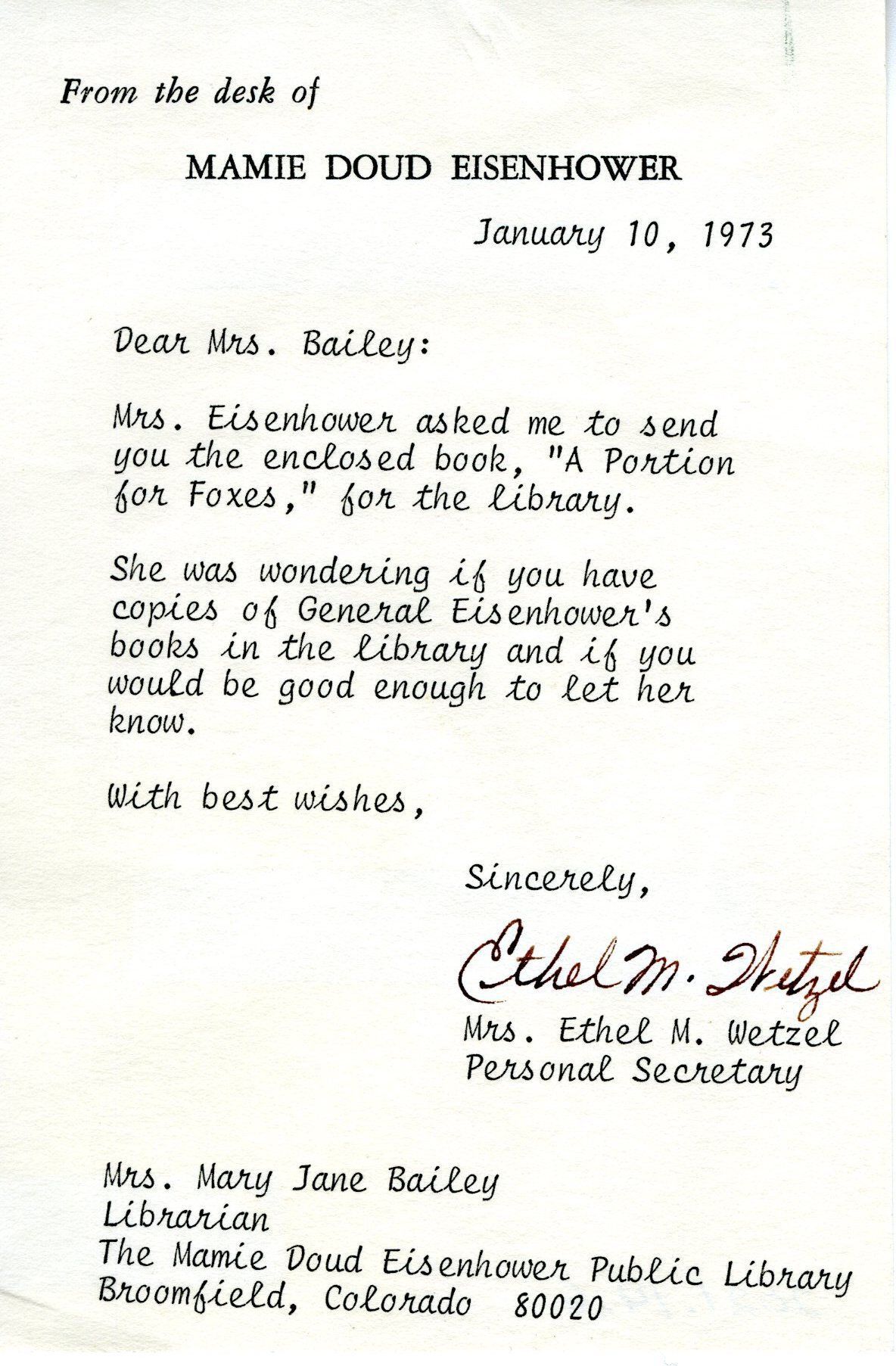 Letter to Librarian Mary Jane Bailey from Ethel M. Wetzel, Personal Secretary to Mamie Doud Eisenhower. As follows: