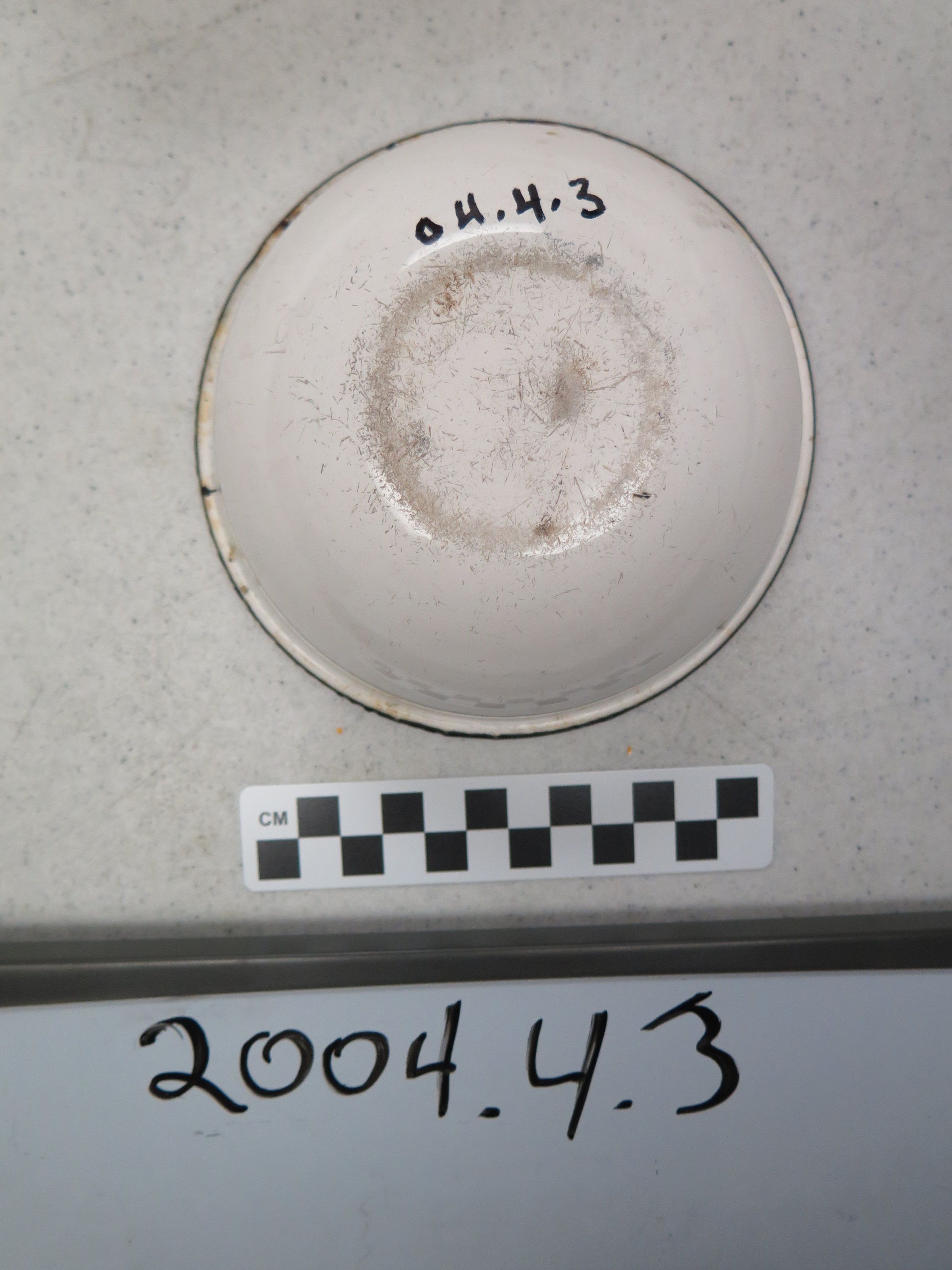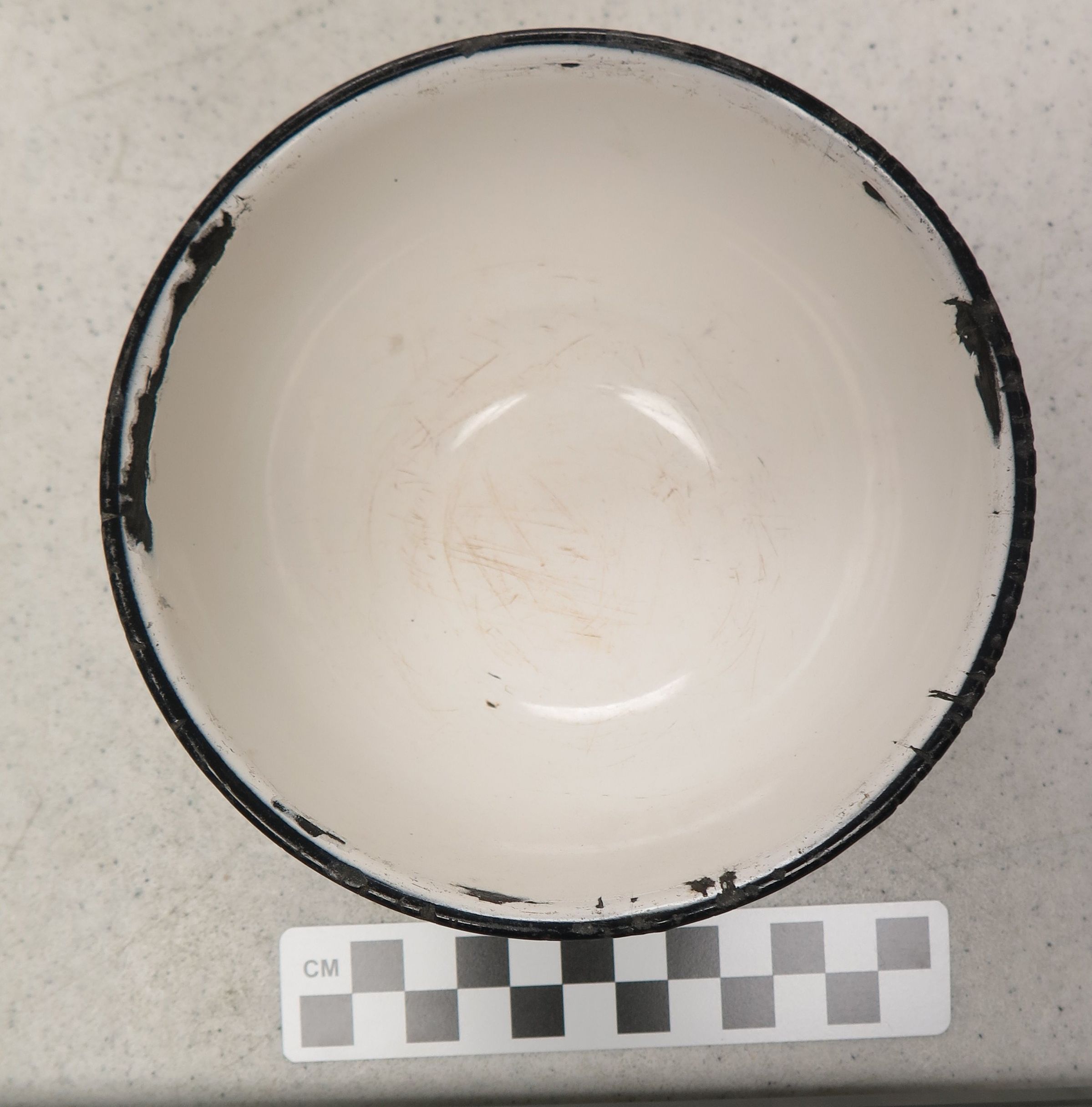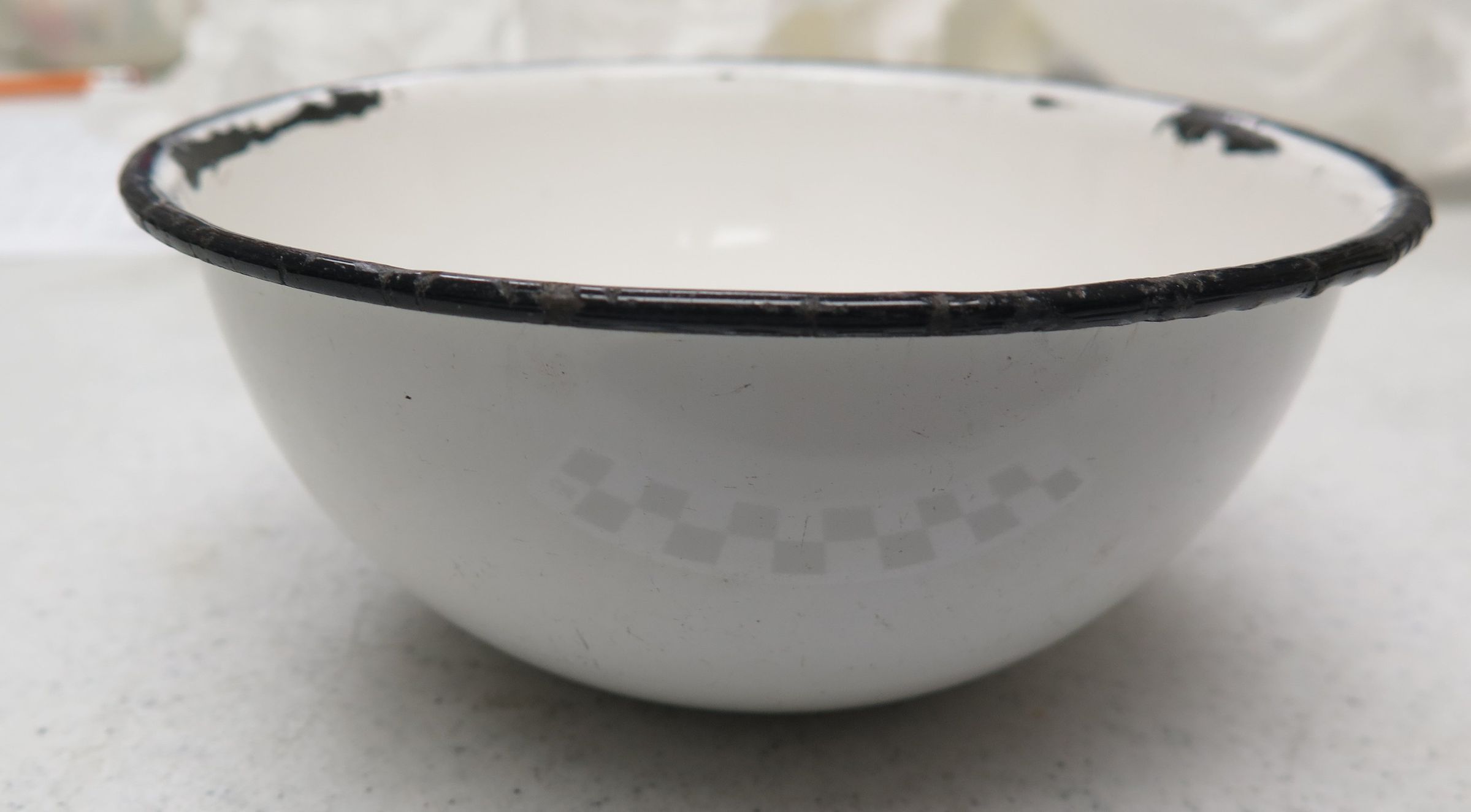 This is a white porcelain or enamel on metal bowl 2.25"(H) x 5.5"(Dia).
