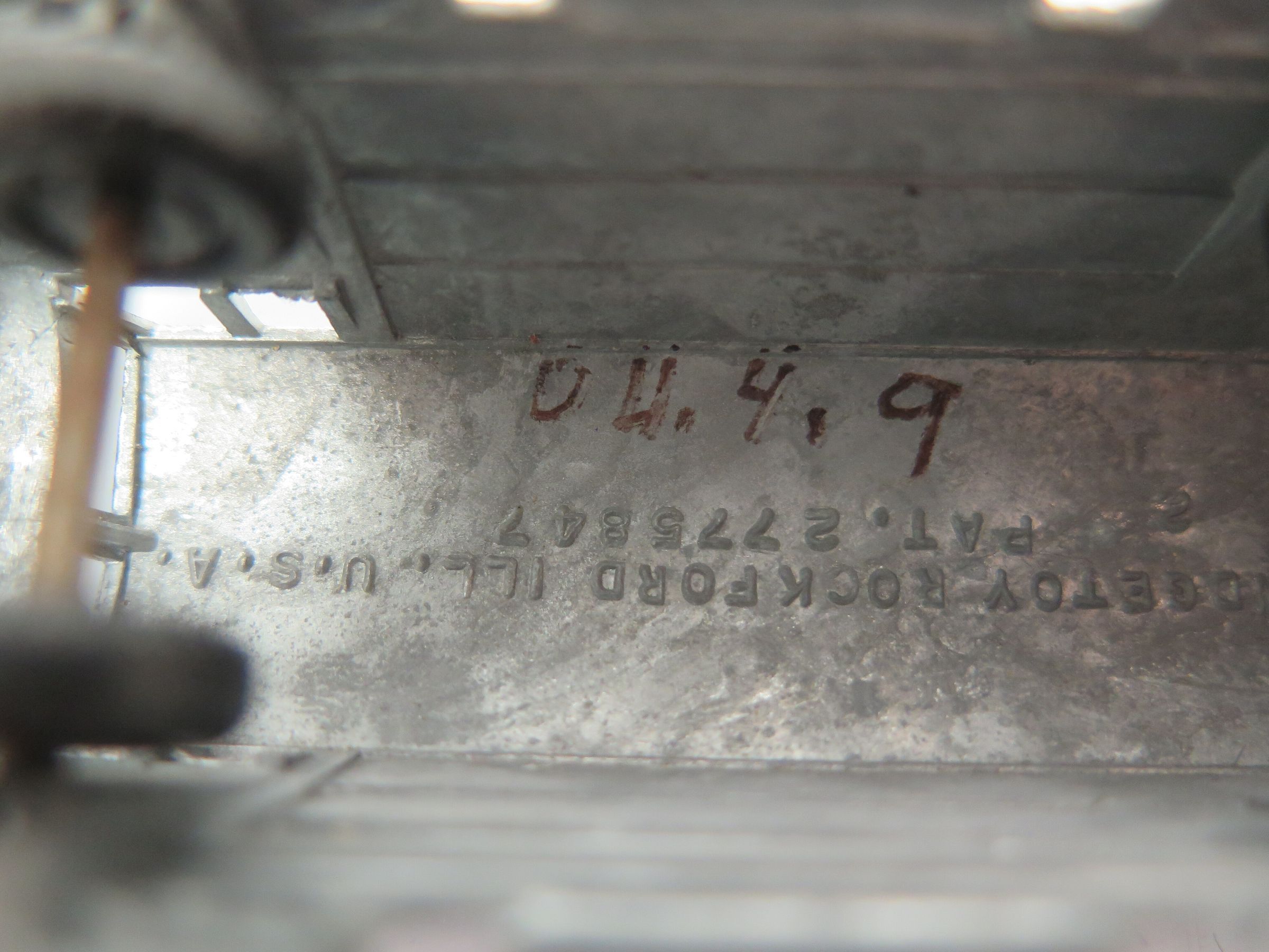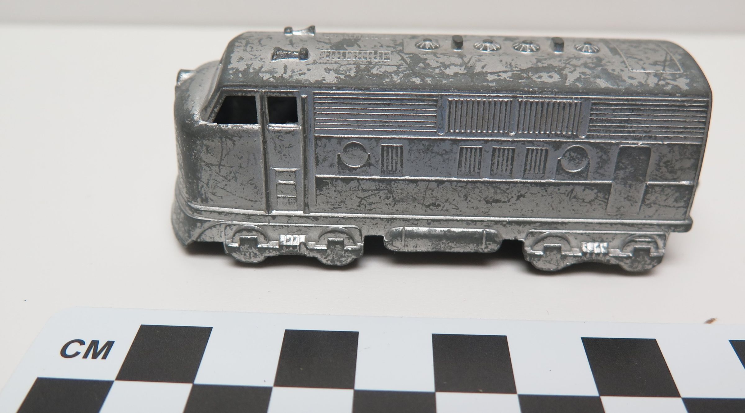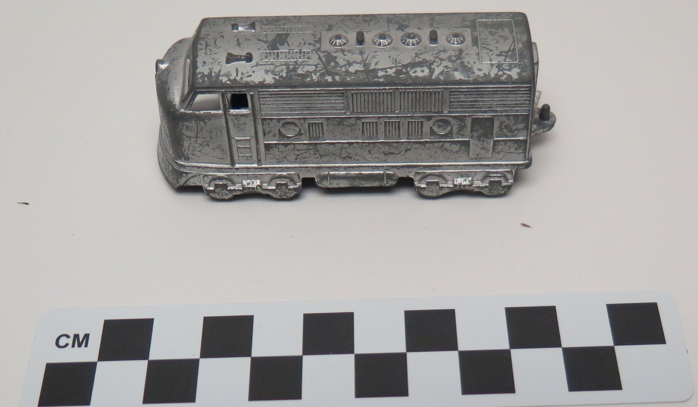 This is a metal toy diesel/electric locomotive of a style indicitive of the 1950s. It has two wire axels with plastic wheels allowing it to smoothly roll. It is silver in color with many casting details throughout. 1.25"(H) x 1.375"(W) x 3.5"(L)Collection