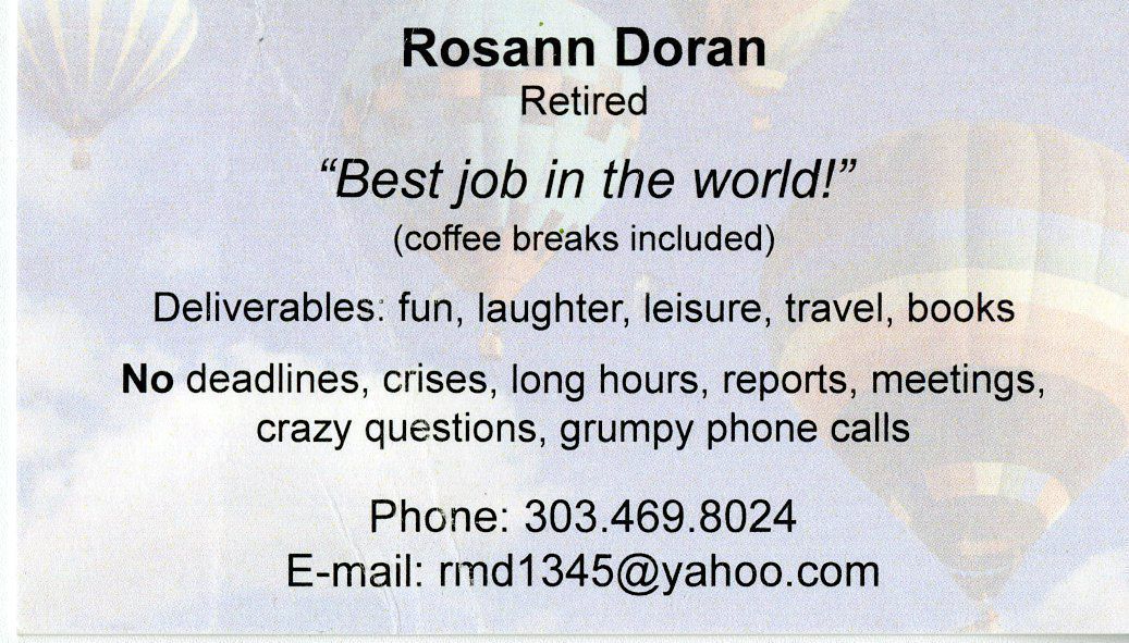 A business card for Rosann Doran after she retired, includes jokes and her contact info.