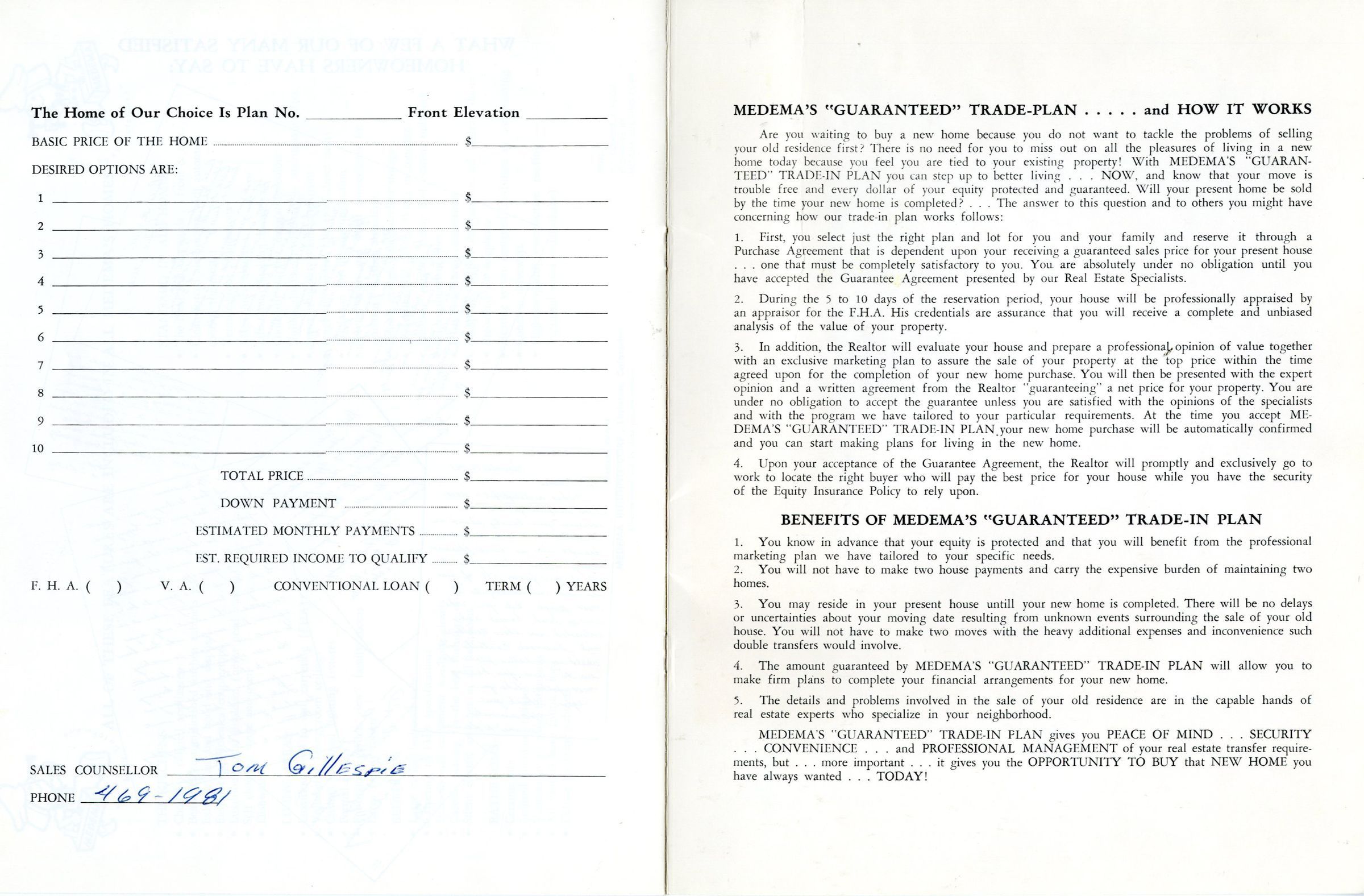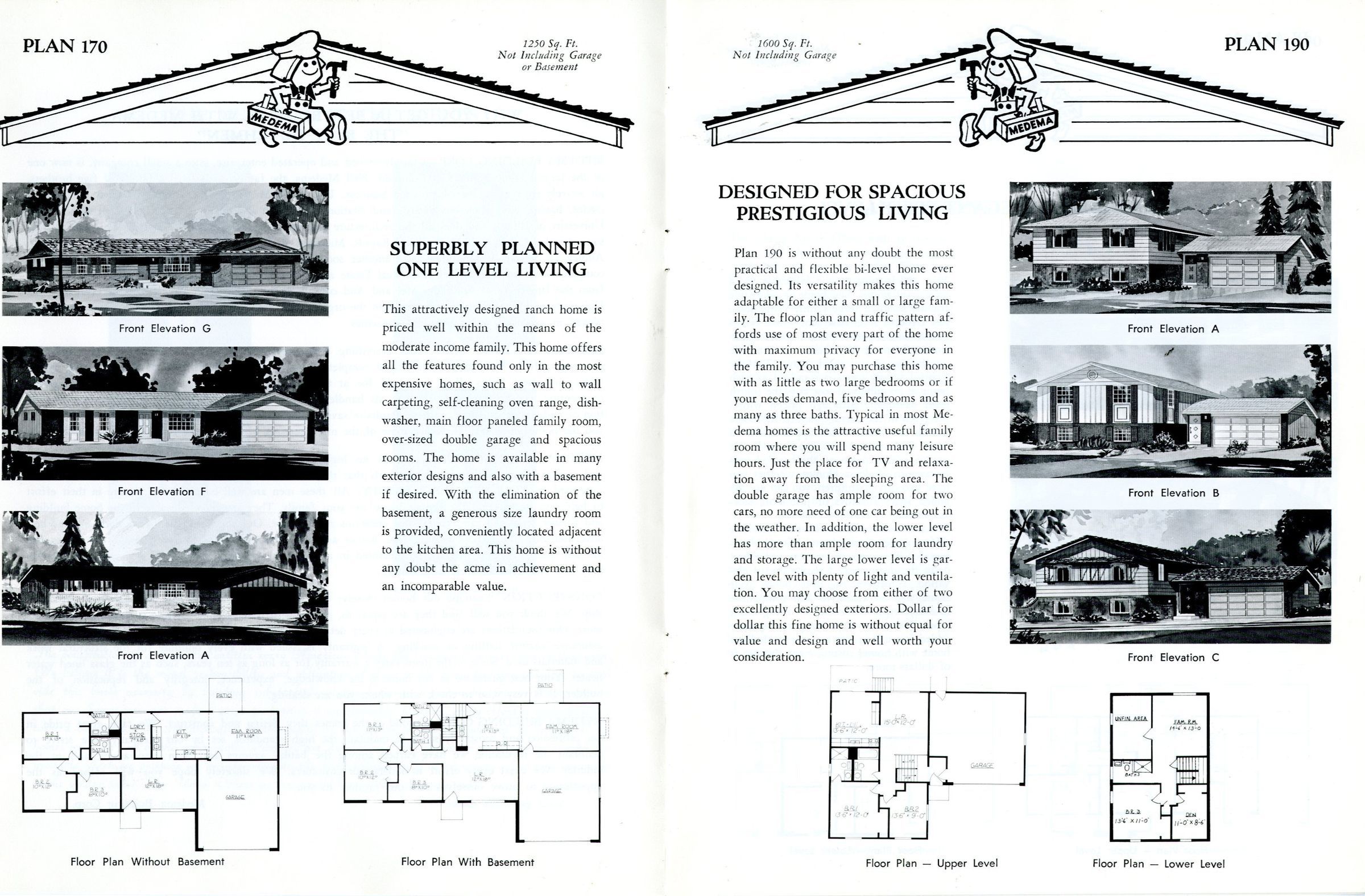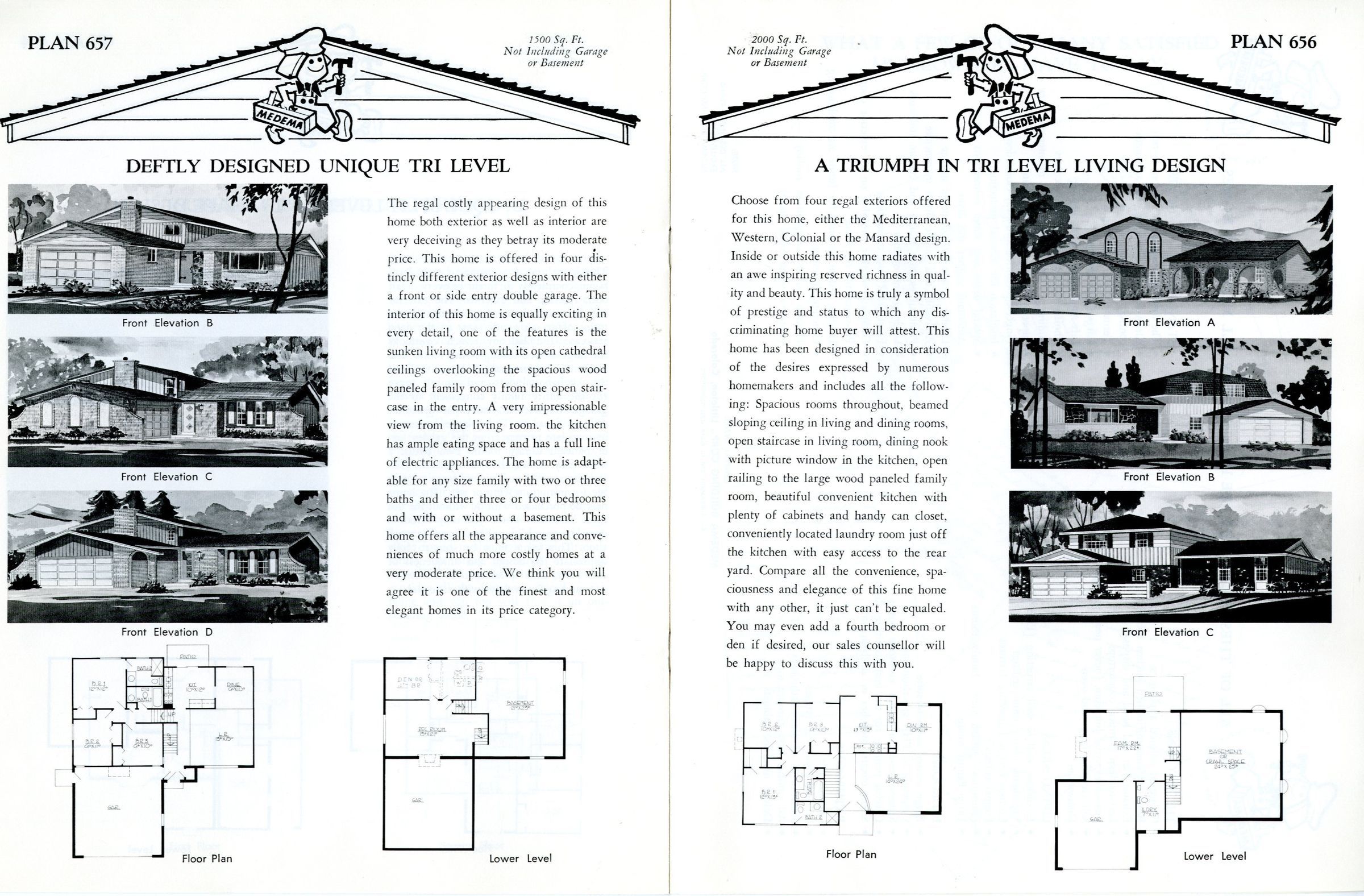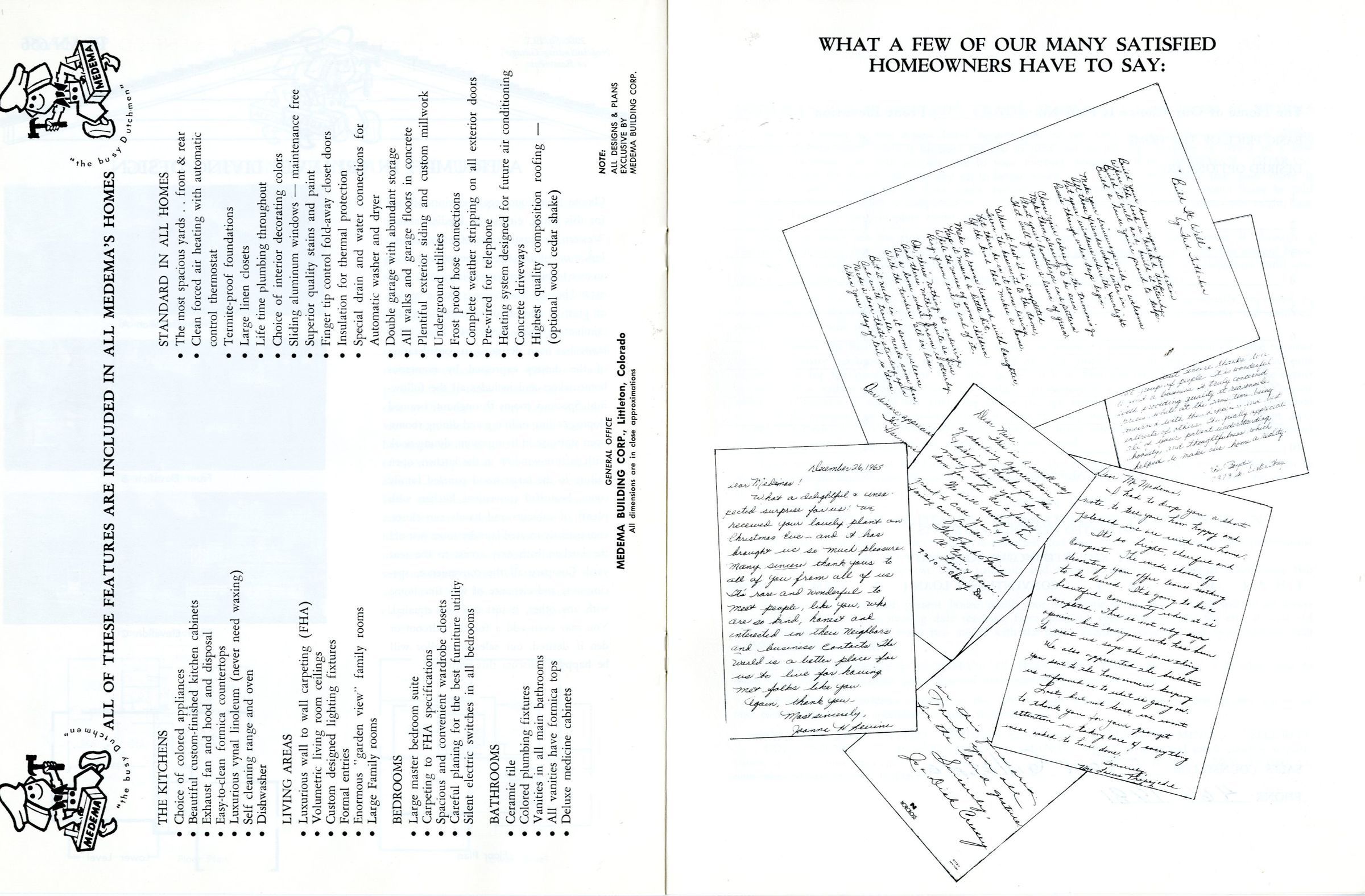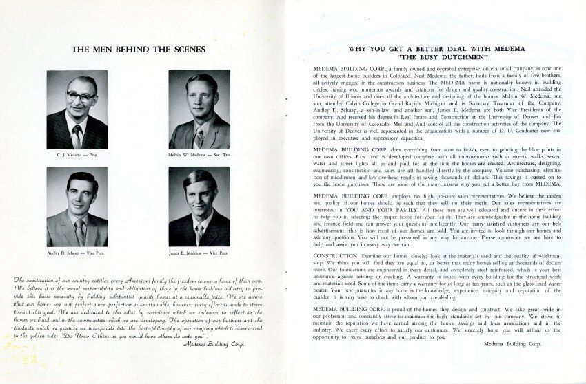 Brochure for "Medema's Planned Homes" - builder of the Miramonte neighborhood in Broomfield. Includes plans and architectural drawings 8 differnt home designs, and information about the builder. Includes ranch and and tri-level designs popular in the mid-1960's and 70s.Collection