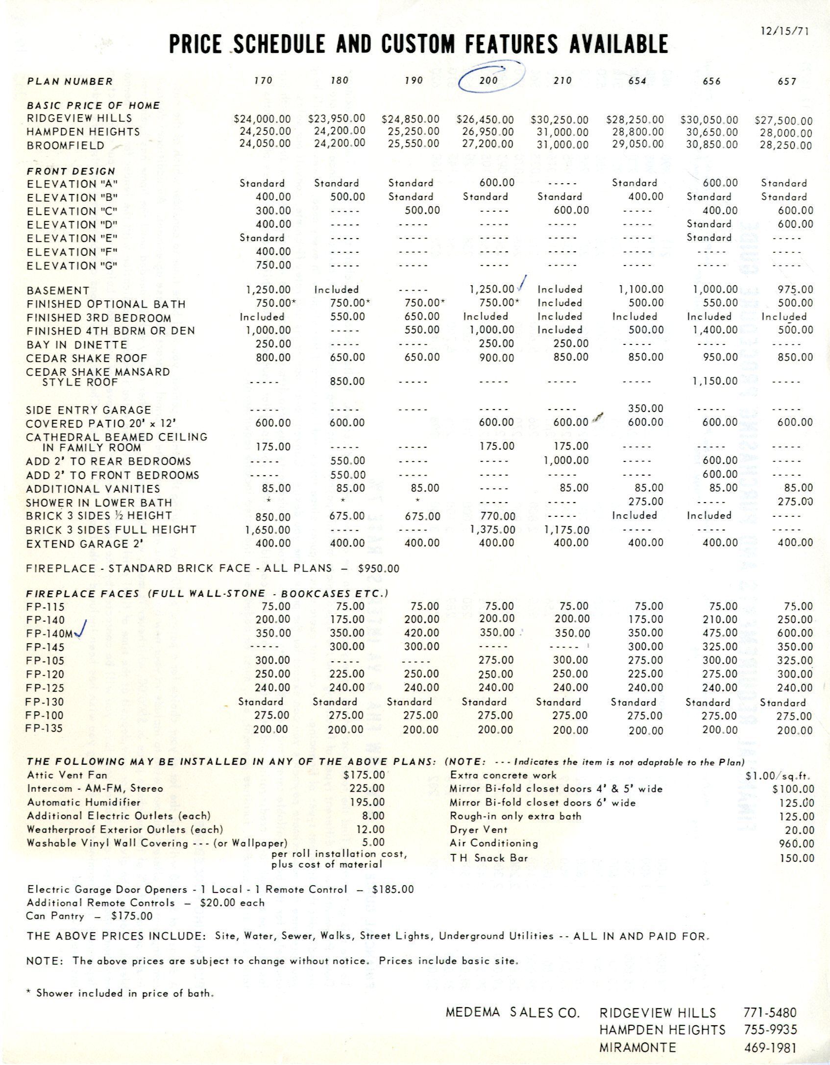 Map (8.5in x11in) of "Medema's Miramonte" showing land plots and houses to be built in the nighborhood around Miramonte Boulevard. 890 Mesa Court is circled and handwritten is "House Bob & Donna [Grass] looked at". An x is also on 1370 W. Holly Drive with the note "House Cobbs later bought & added addition to."