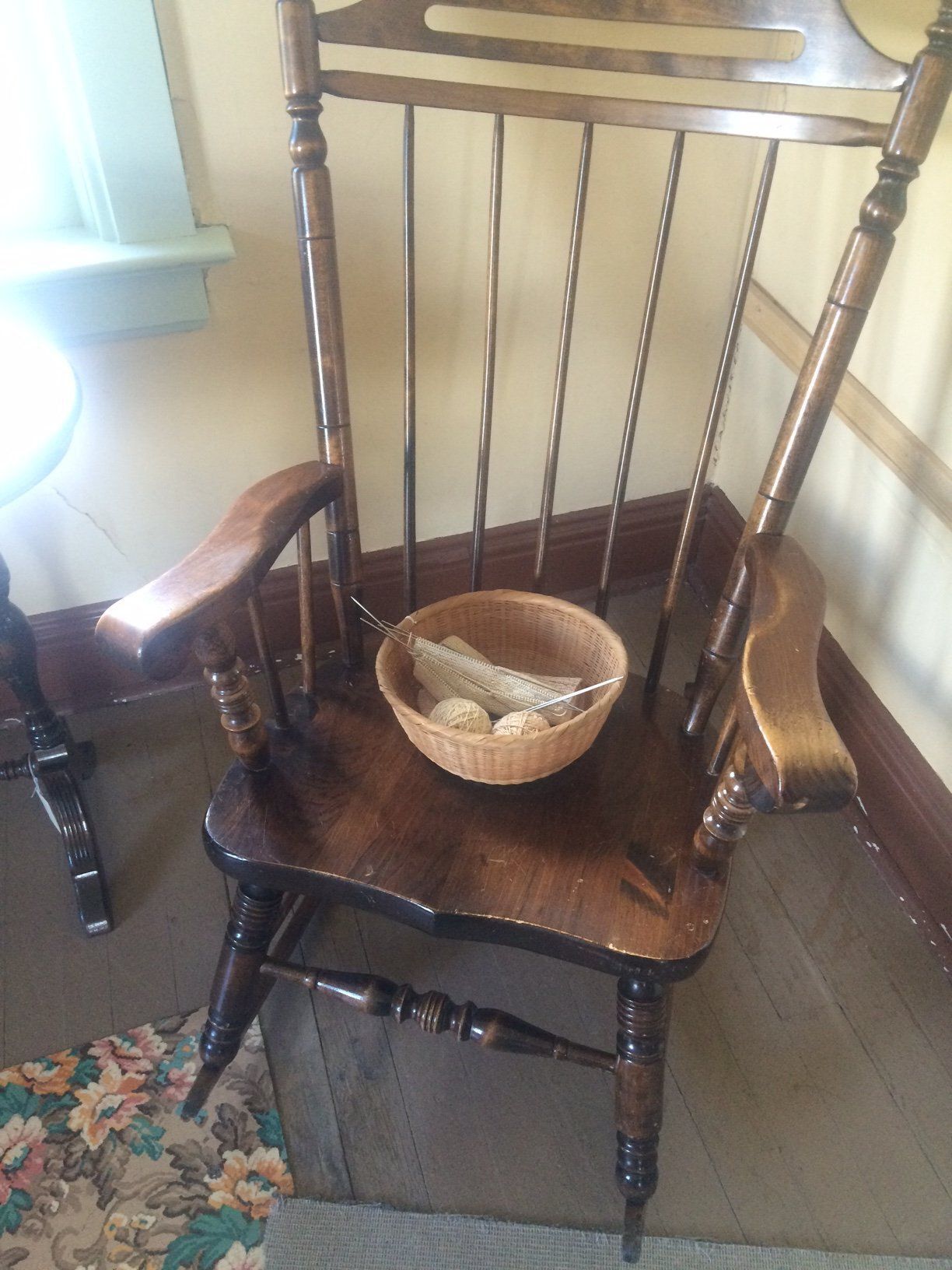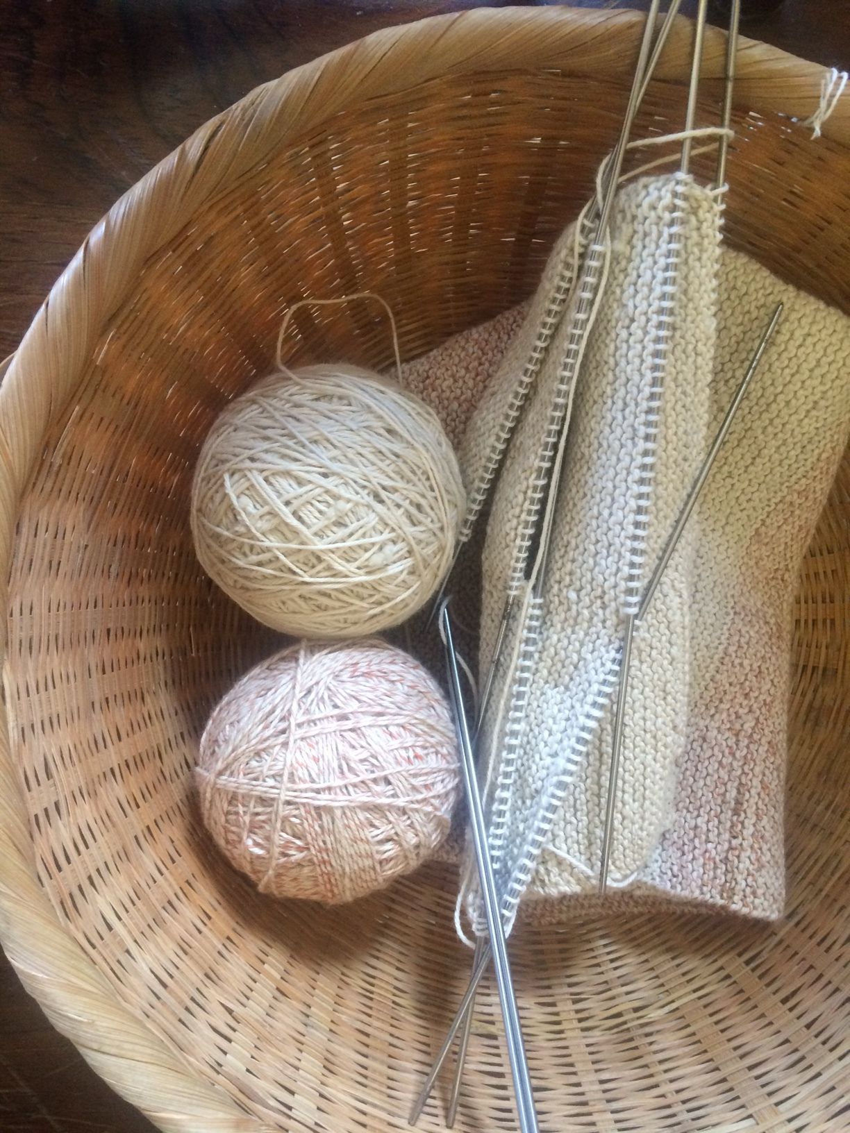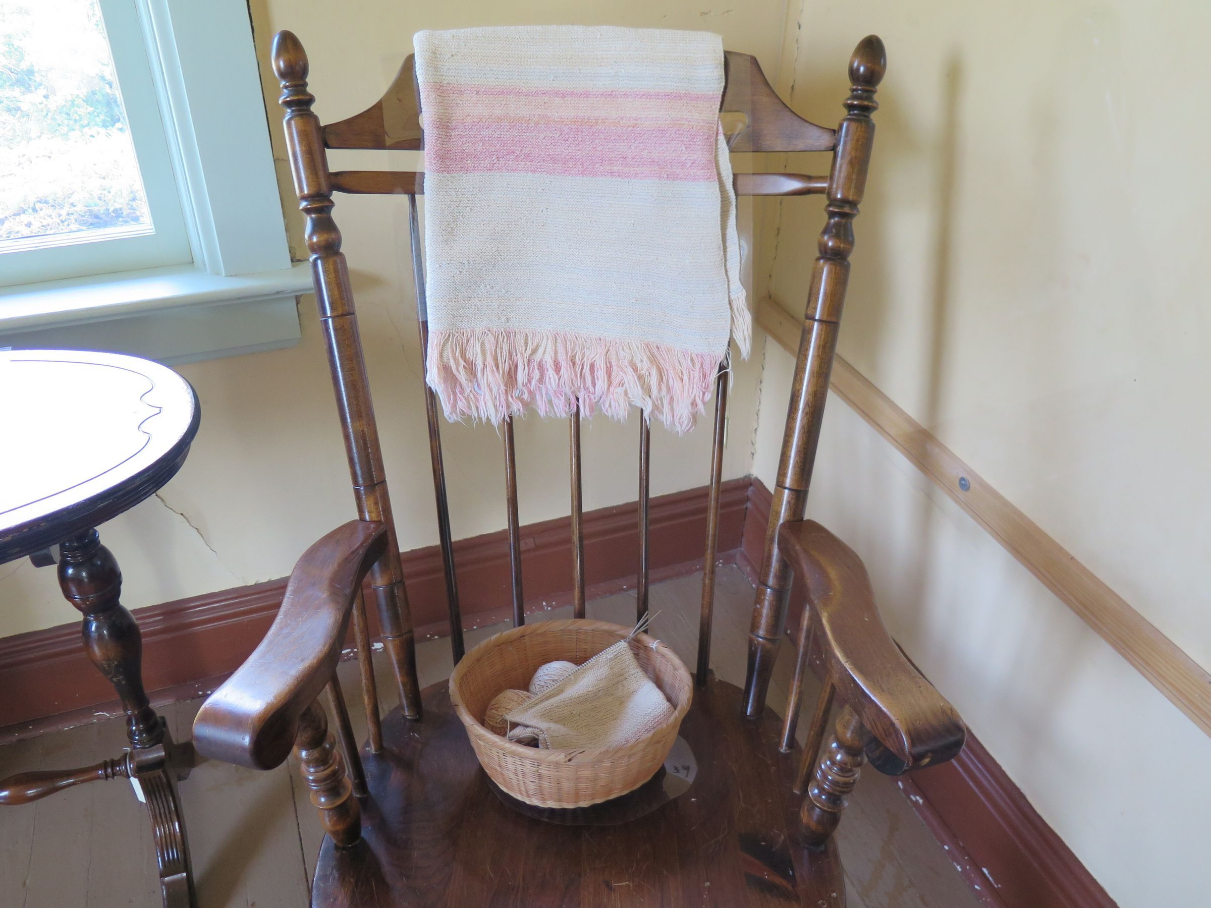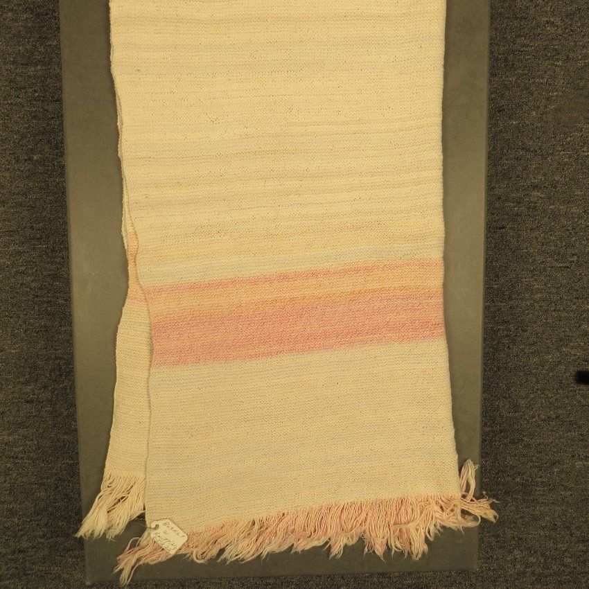 A 10.5" (diameter) by 4.5" high basket containing 8 metal needles, 2 balls of yarn, and one piece of knitting work. Also included is a knitted blanket of the same pink and white material. The blanket has fringe at the bottom and measures 28" (w) x 53" (l).Collection