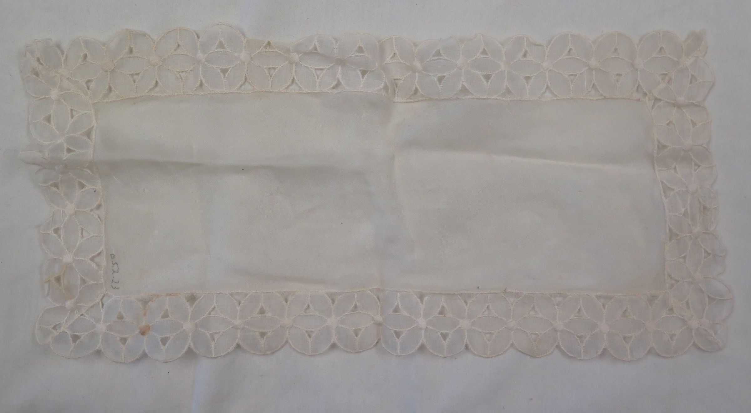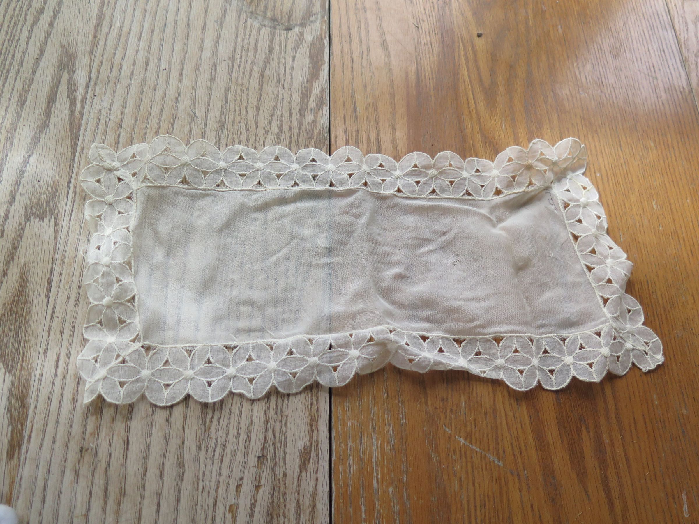 This is a white rectangular doily with a floral design on the edges. Doily measures 7" (w) x 14.25" (l).