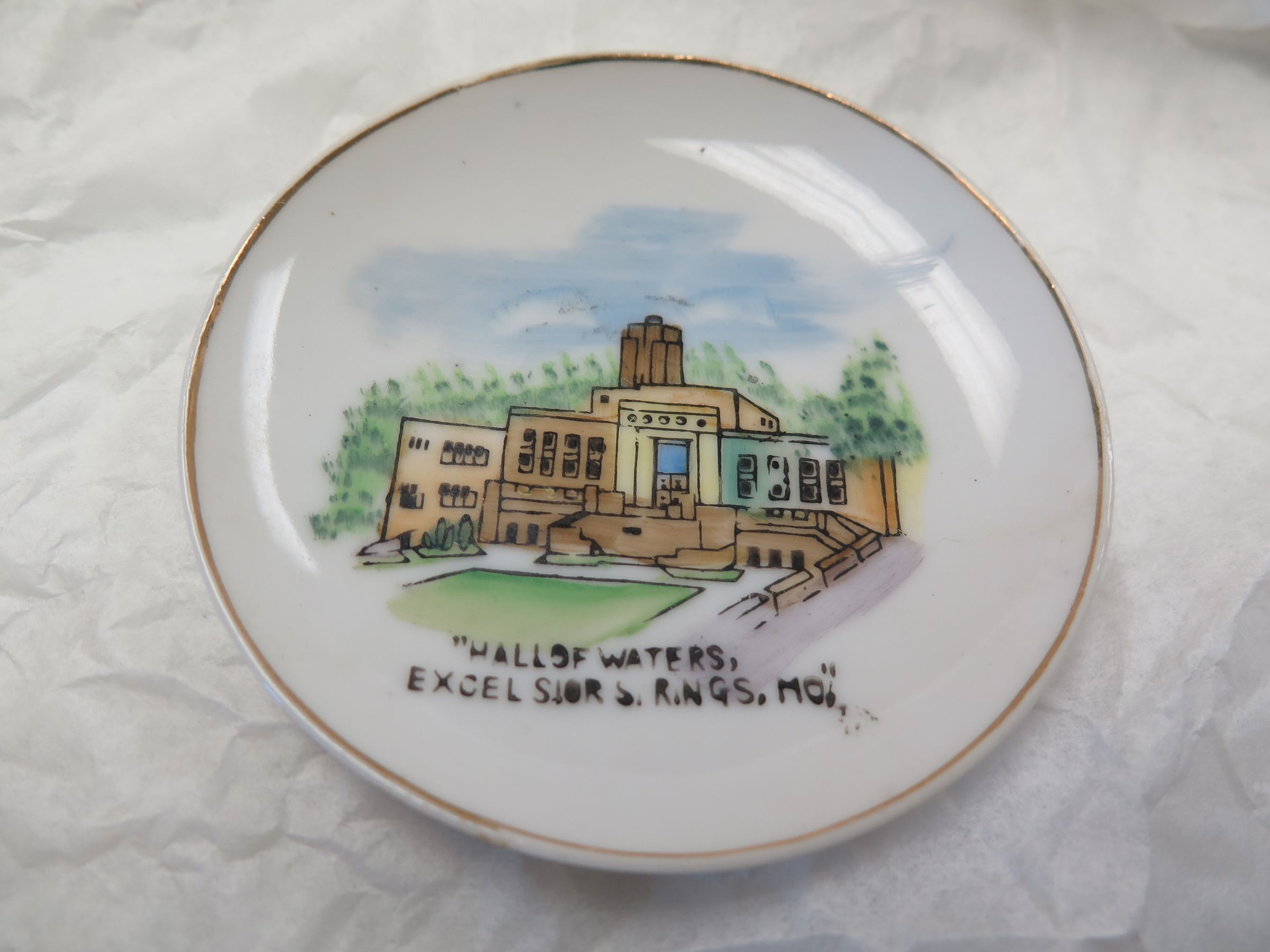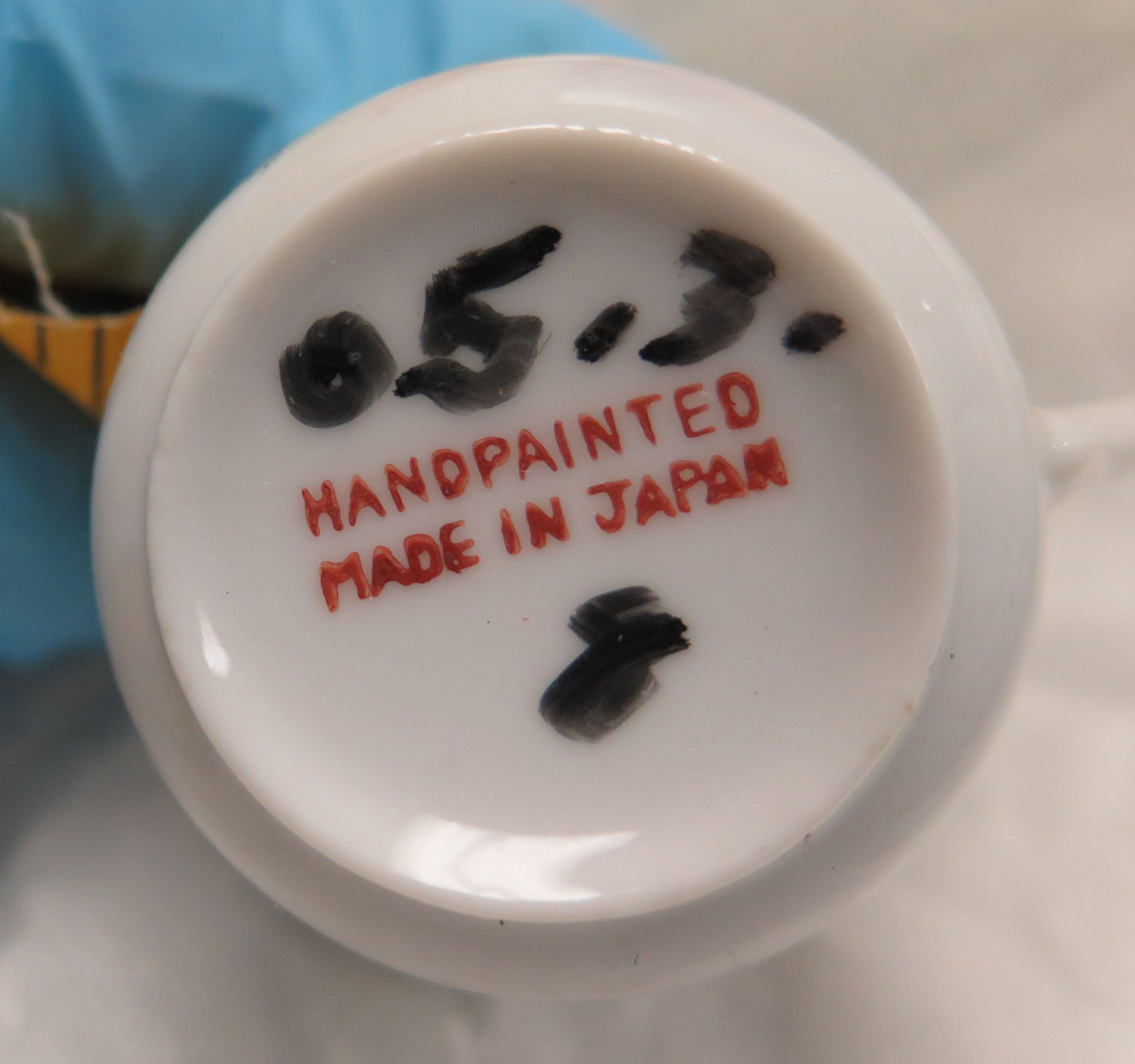 This is a hand-painted cup and saucer set. The set is from "Hall of Waters". Both the cup and saucer were made in Japan. The cup measures 2" (h) x 1.75" (dia). The saucer measures 4" (dia).