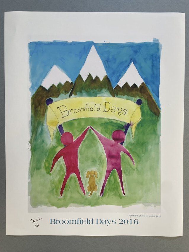 Colored Broomfield Days 2016 poster, "Together". Signed by artist 1 of 50. Two pink figures, arms extended overhead, hands touching, dog sitting between them. Banner says Broomfield Days, three snow covered mountains, blue sky.Lexicon