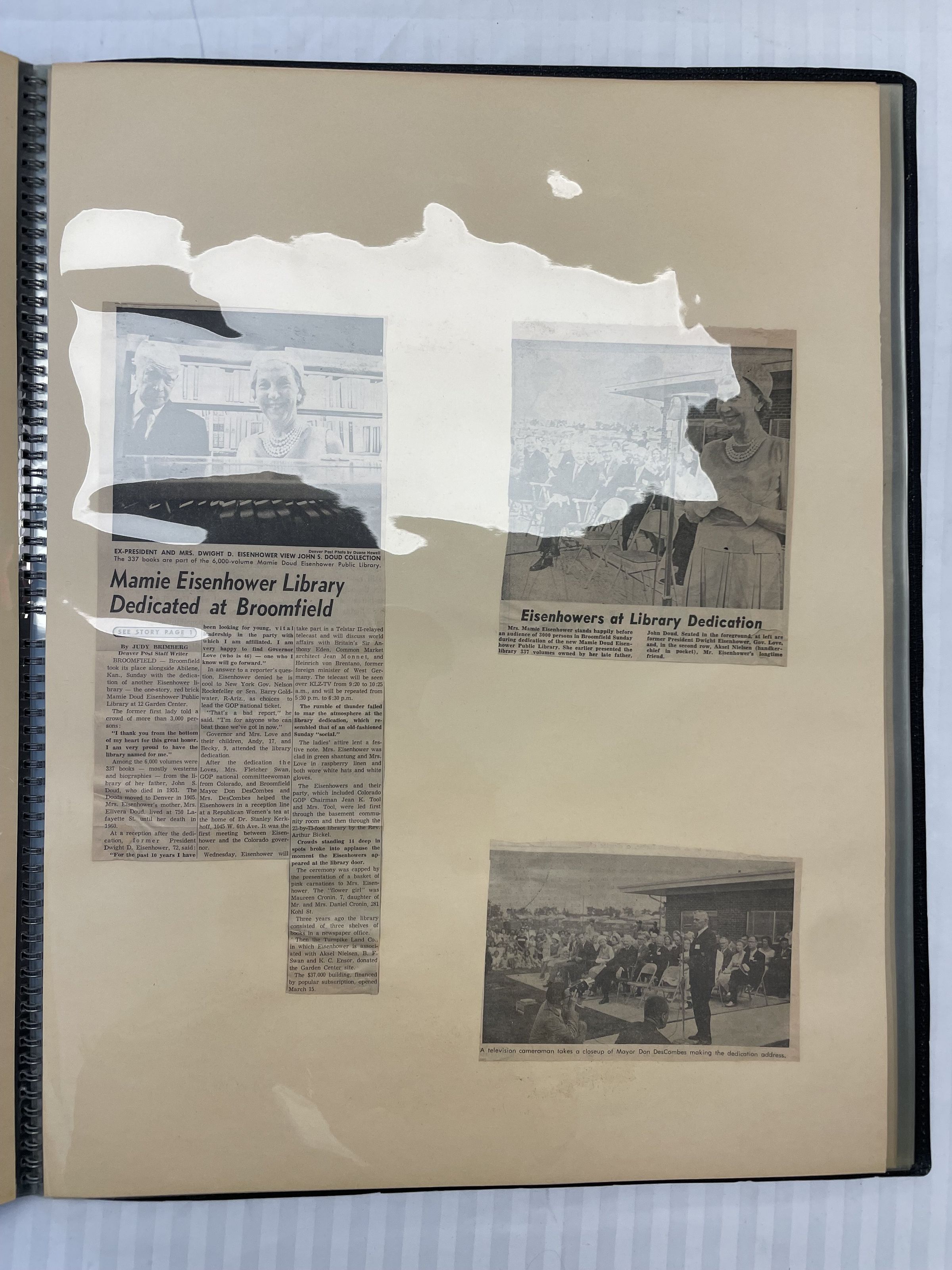 Large album titled Broomfield Library Friends with newspaper clippings from 1963 through 1965. New Broomfield Mamie Doud Eisenhower Public Library, Ike and Mamie Eisenhower dedicate library, Gov. John Love, wife Ann Love, Mayor Don DesCombes, Maureen Cronin, Dr. Richard Webb, Aksel Nielsen, Head Librairian Mrs. Mary Jane Bailey, Dr. and Mrs. Stanley A. Kerkhoff, Broomfield Republican Women's Club, Boulder County Republican Women's Club., Bal Swan of Empire Savings, Adult Education, Library Friends Silver Tea for scholarship fund, hobby show and poster contest, Denver Post, Rocky Mountain News, election for officers, summer story time, Ann Crouse, open house, Book Week Drive, "The Thirteenth Rib by Footlighters Drama Group.Collection