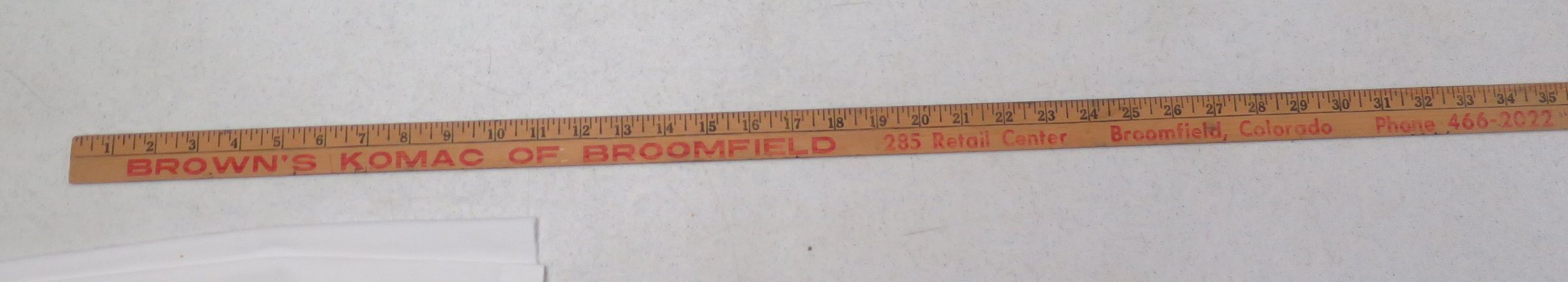 This wooden yardstick measures 1.125"(W) x 36"(L). Text in red read's BROWN'S KOMAC OF BROOMFIELD 285 Retail Center Broomfield, Colorado Phone 466-2022.