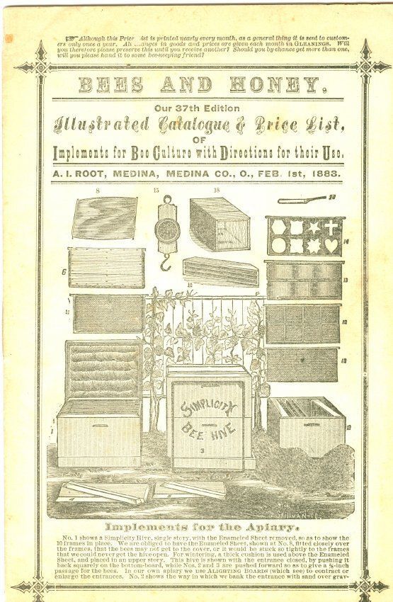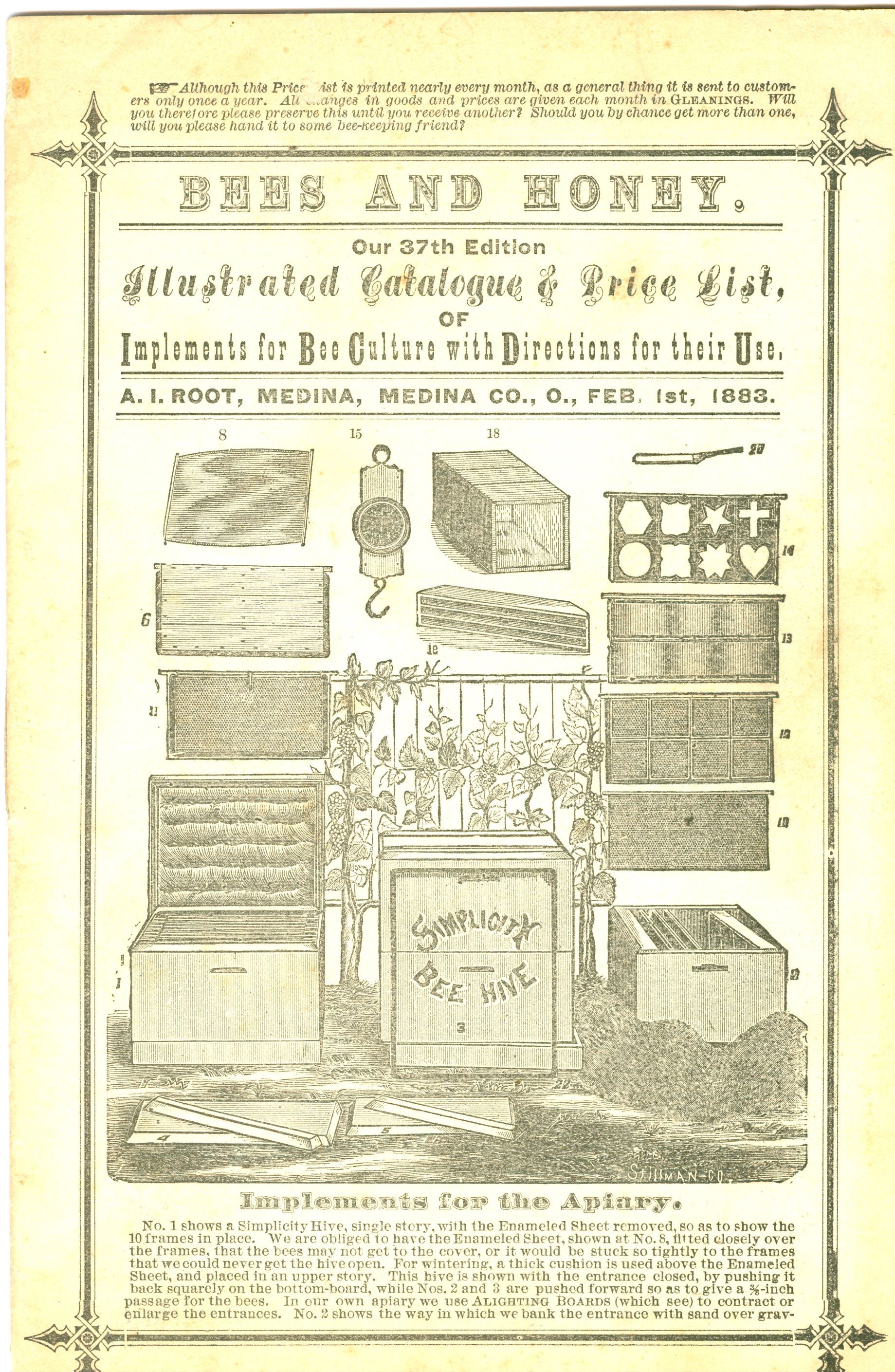 Digital download of a February 1883 cover of a magazine/catalogue called "Bees and Honey" featuring illustrations of "Implements for Bee Culture with Directions for their Use" and "Implements for Apiary."Lexicon