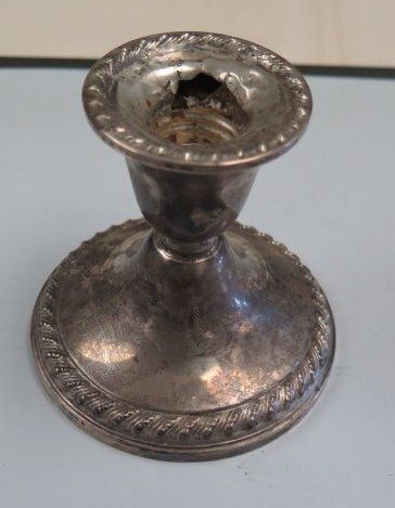The silver candle holder measures 3.5"(h) x 3.5" (d).