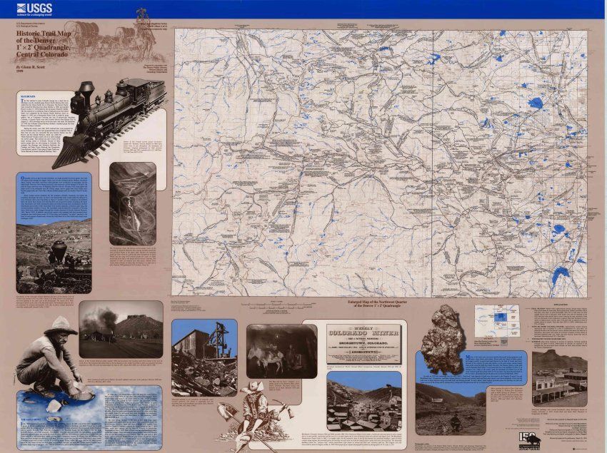 Historic Trail Map of Denver. Digital file (PDF) of a 1998 educational poster from the US Geological Survey with a map of Colorado/Denver that shows the railroad lines and trail routes. Shown are the Overland Trail Route, the Interurban C&C, the Burlington Route, with Broomfield and Zang's Spur as stops.