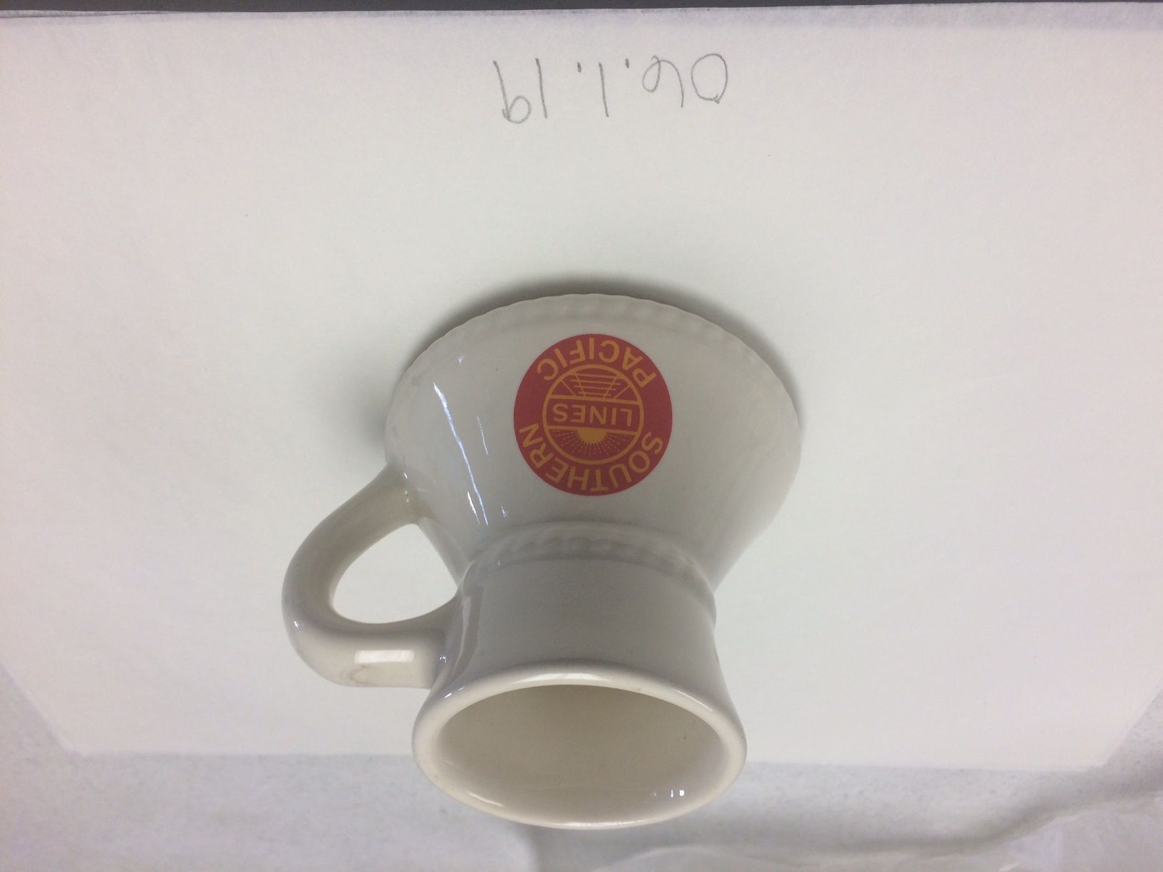This is a white ceramic mug with a handle and the Southern Pacific Lines logo on the side. The mug has a larger base than opening at the top. The mug measures 3.75" (h) x 5" (w).