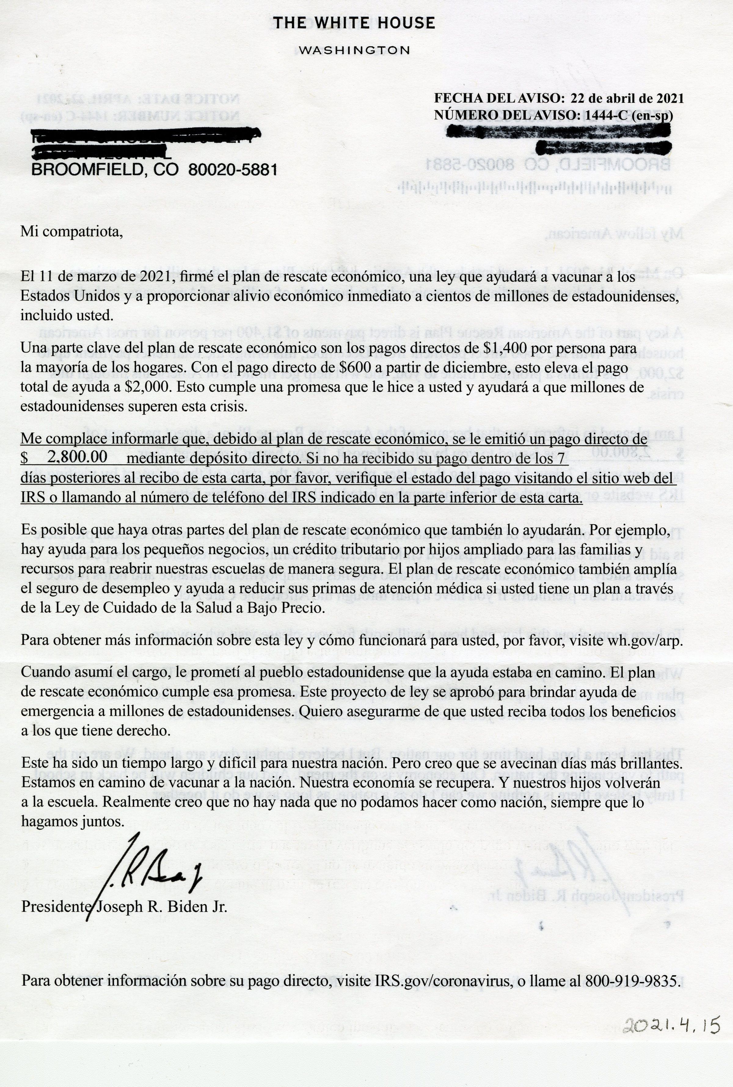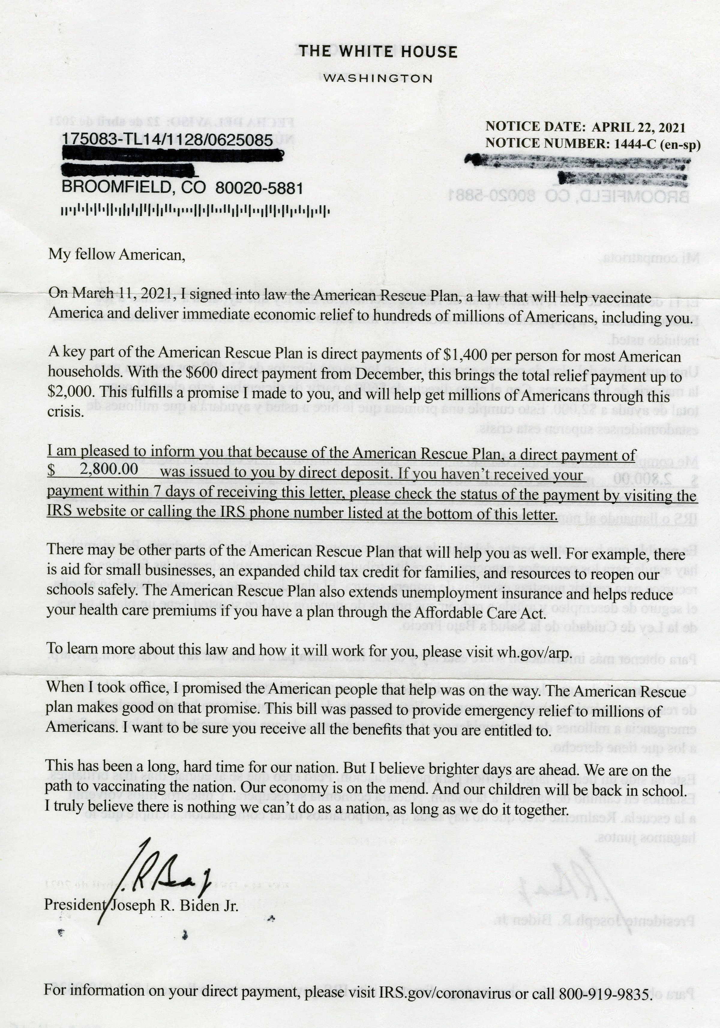 COVID-19 Stimulus Payent Letter from Joe Biden, April 22, 2021Entry/Object ID