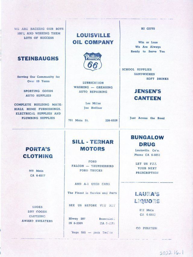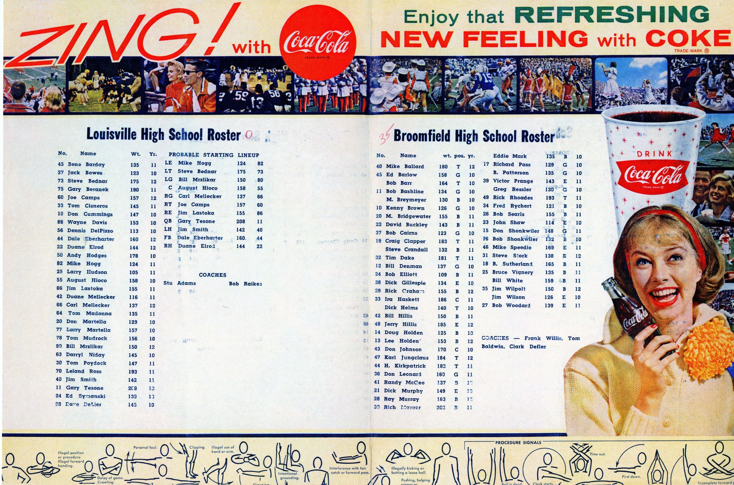 Folded single piece of paper. Cover features two football players against a yellow background. Inside has roster of plaers for both Louisville High School and Broomfield High School, along with an ad for CocaCola. Back cover has ads for local businesses: Steinbaughs, Porta's Clothing, Louisville Oil Company, Sill-Terhar Motors, Jensen's Canteen, Bungalow Drug, and Laura's Liquors.Collection