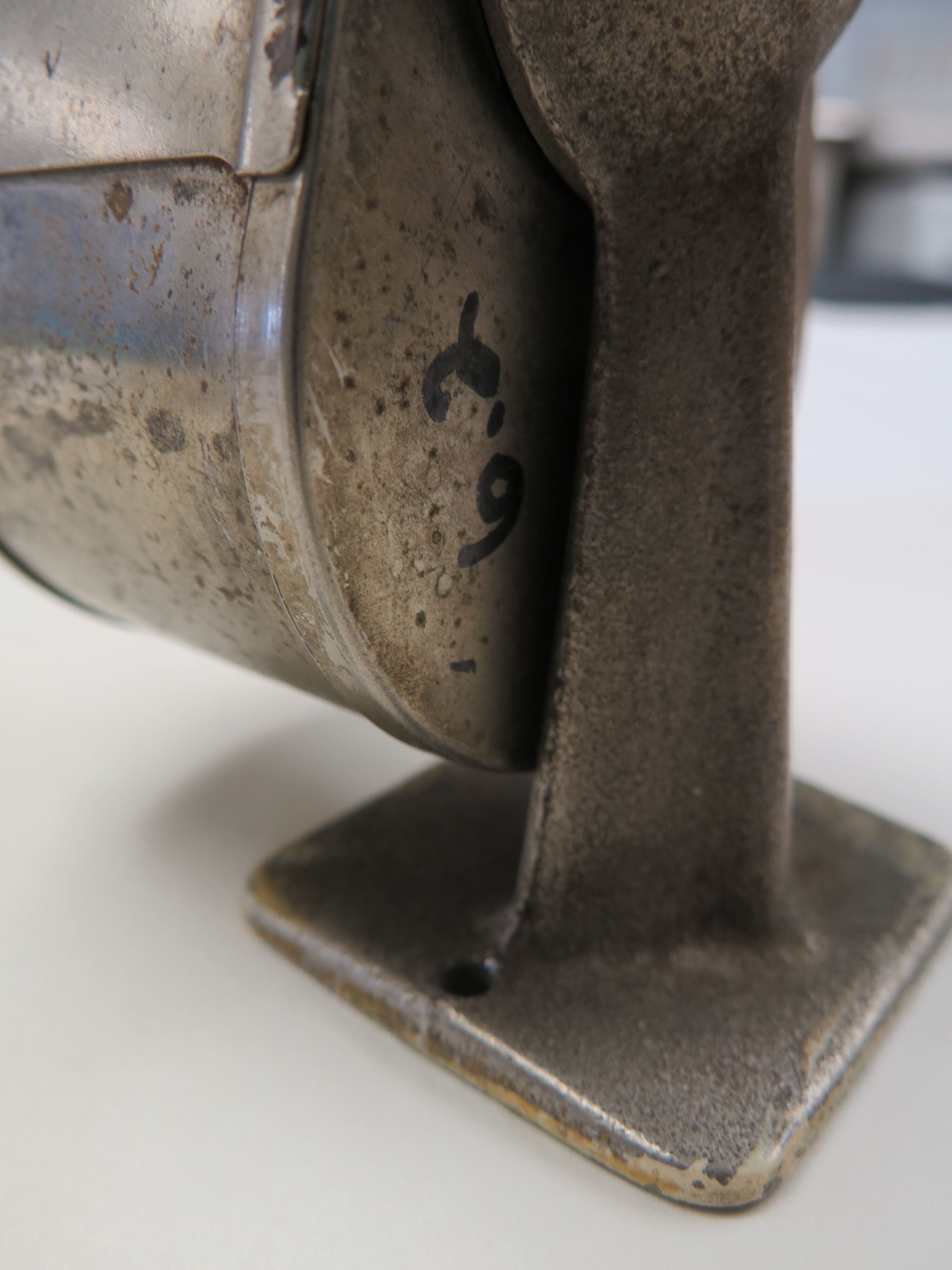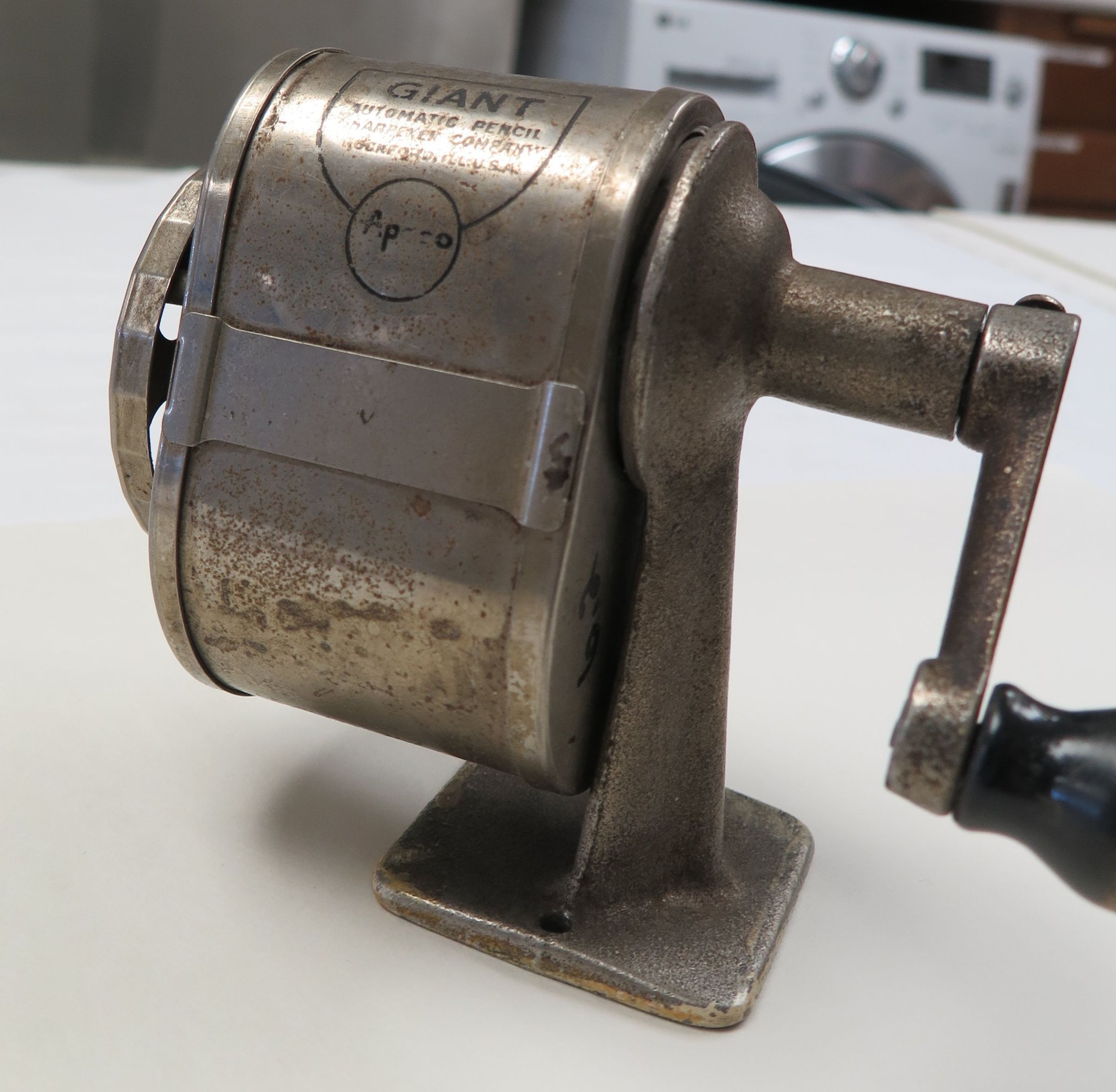 This is a metal pencil sharpener with a black wood handle. The sharpener has a removable middle section where the pencil shavings collect. The face of the sharpener has holes of different sizes that can be rotated to allow for the pencil to fit. The sharpener measures 4.25" (h) x 5" (w) x 2" (l).Collection
