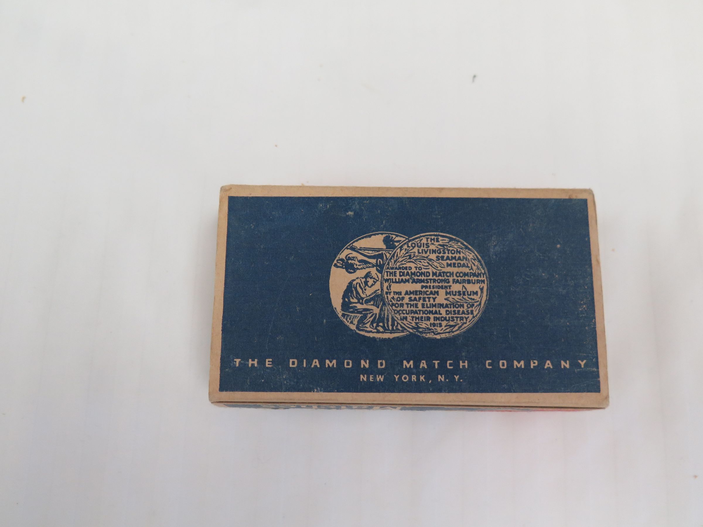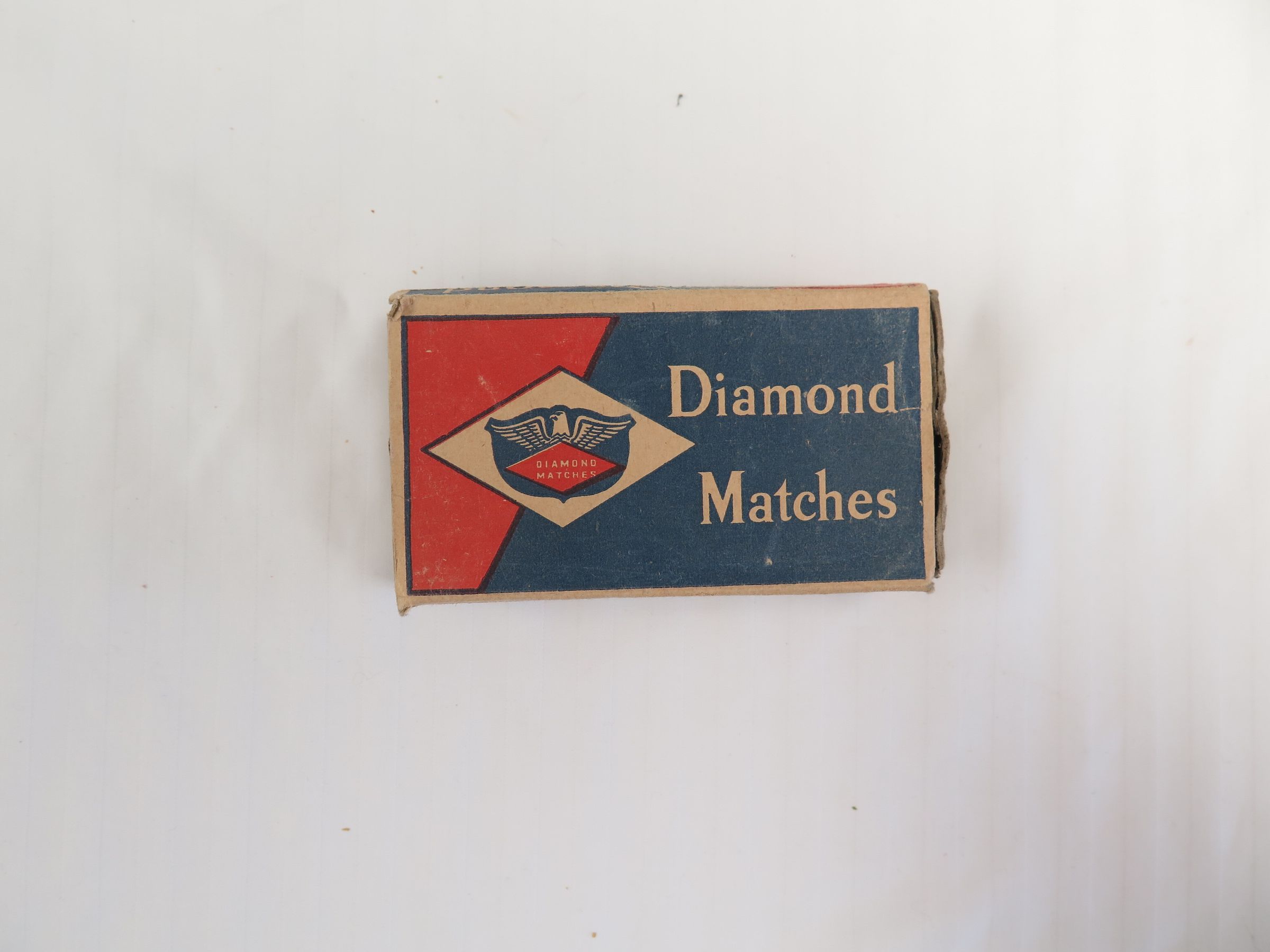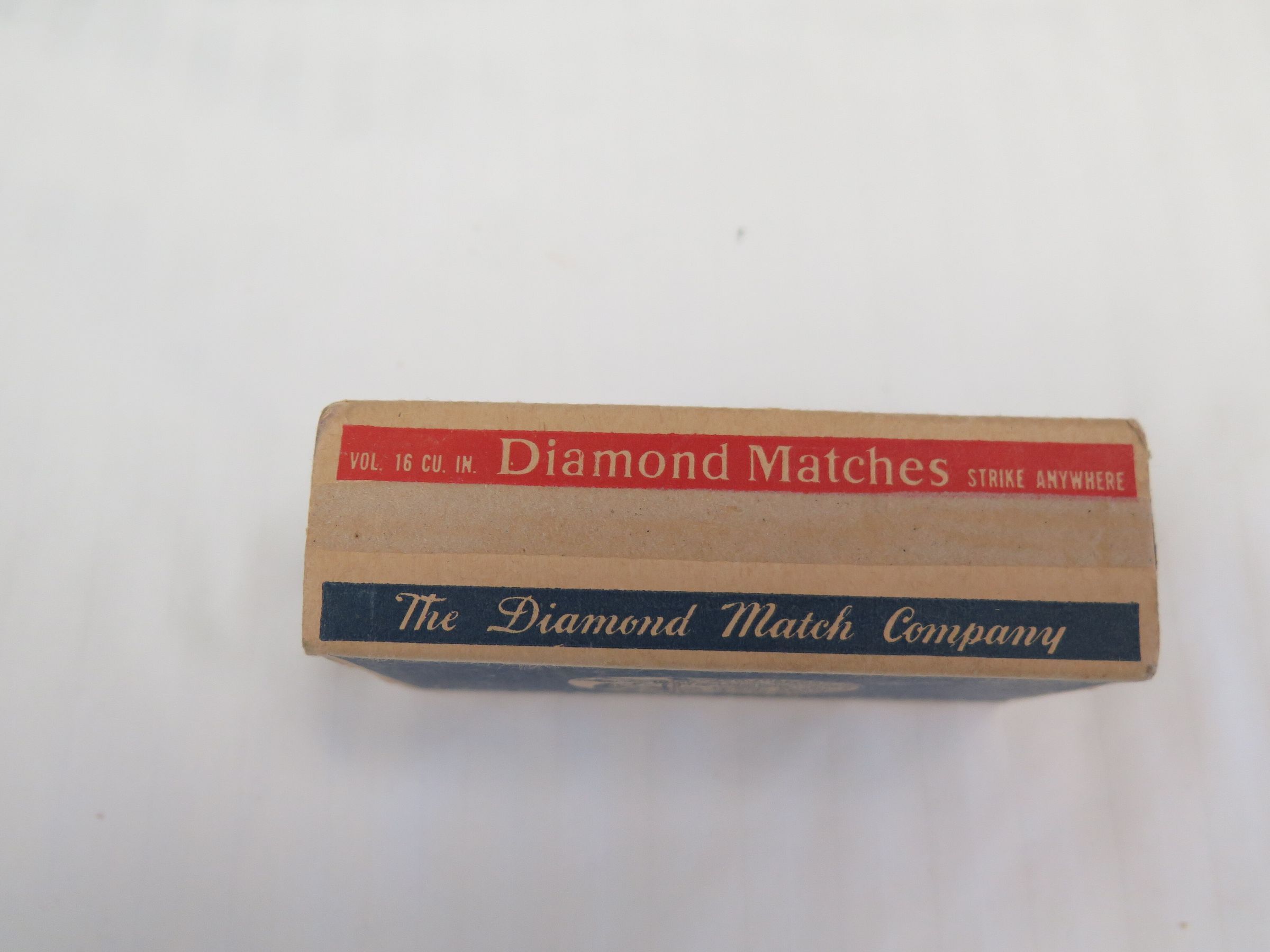 This is a cardboard matchbox of Diamond brand matches. The cover of the box is red and blue with white text. The box measures 2.75" (h) x 4.75" (w) x 1.5" (d).