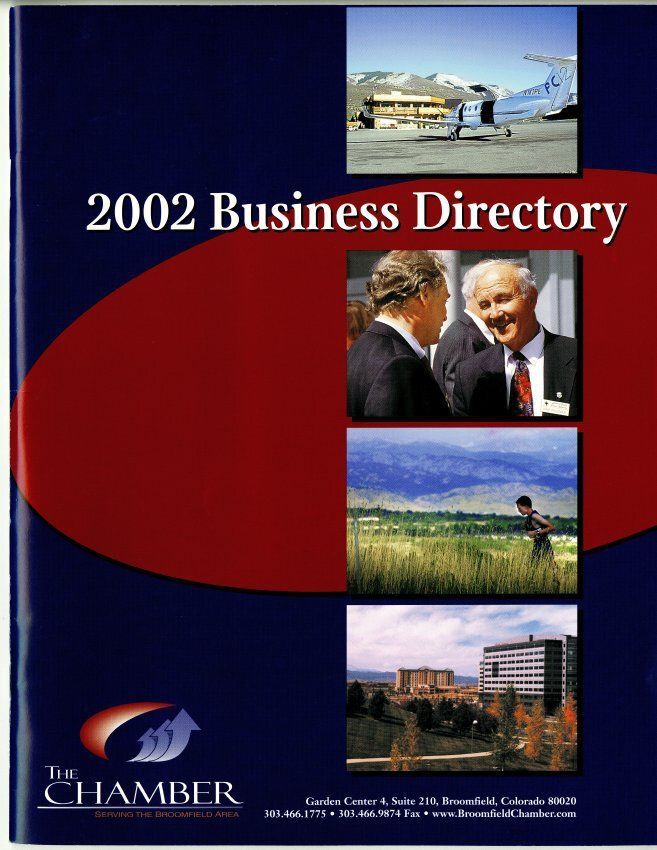 2002 Business Directory, by The Chamber, 56 page directory published for Broomfield. Topics covered include The Chamber Board of Directors & Officers and it's mission, Committees and Task Forces, describes life in Broomfield, Broomfield Community Information, Broomfield Economic Information, Broomfield Newcomber Information, Visitor Information, Important Phone Numbers, 2002 Membership Directory. 2002 Who's Who, 2002 Business Directory.Collection