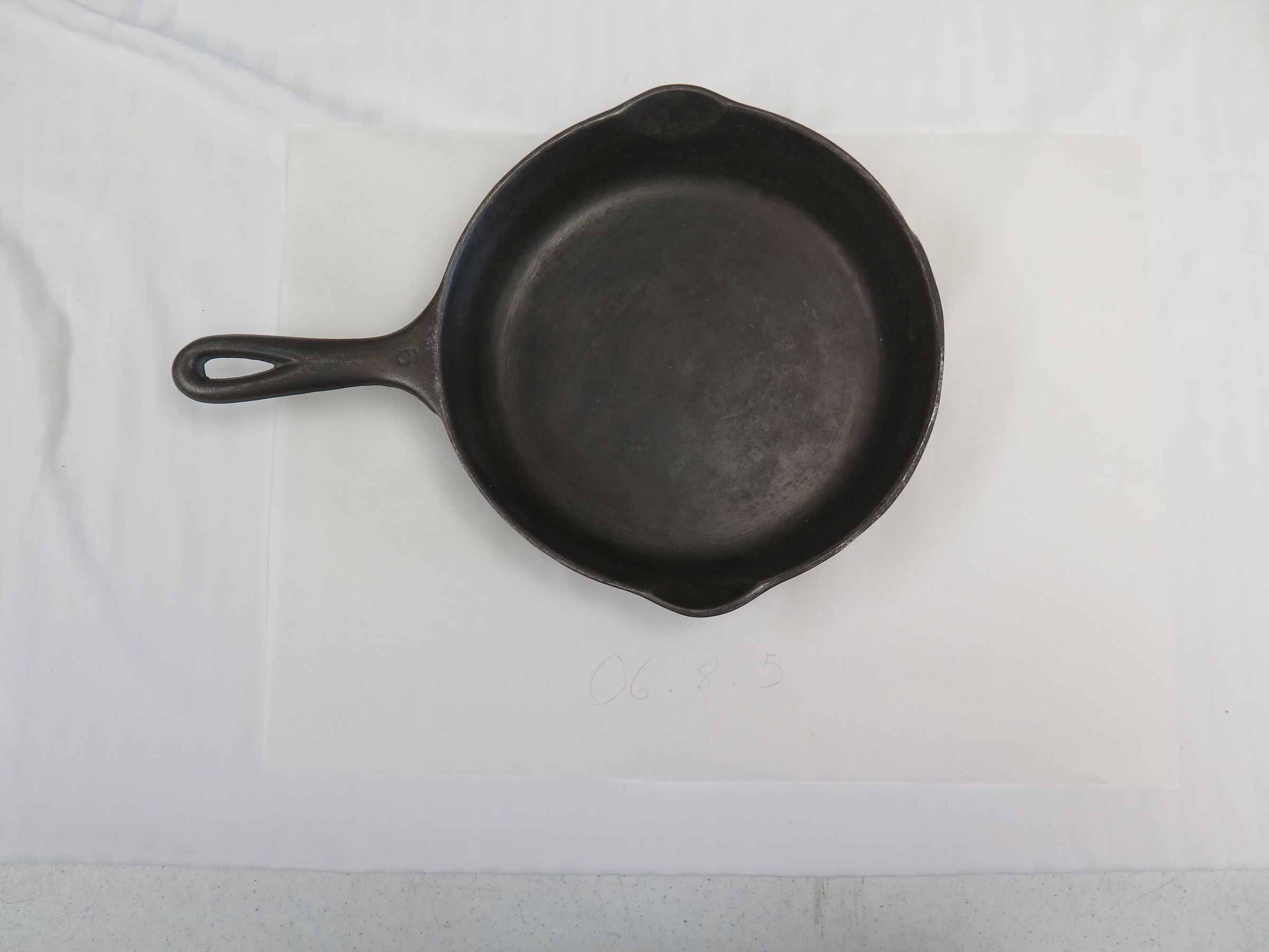 This is a black cast iron frying pan or skillet with a long handle on one side. The handle has a hole in it where the pan could be hung. The frying pan measures 1.75" (h) x 13.5" (w) x 9.5" (l).